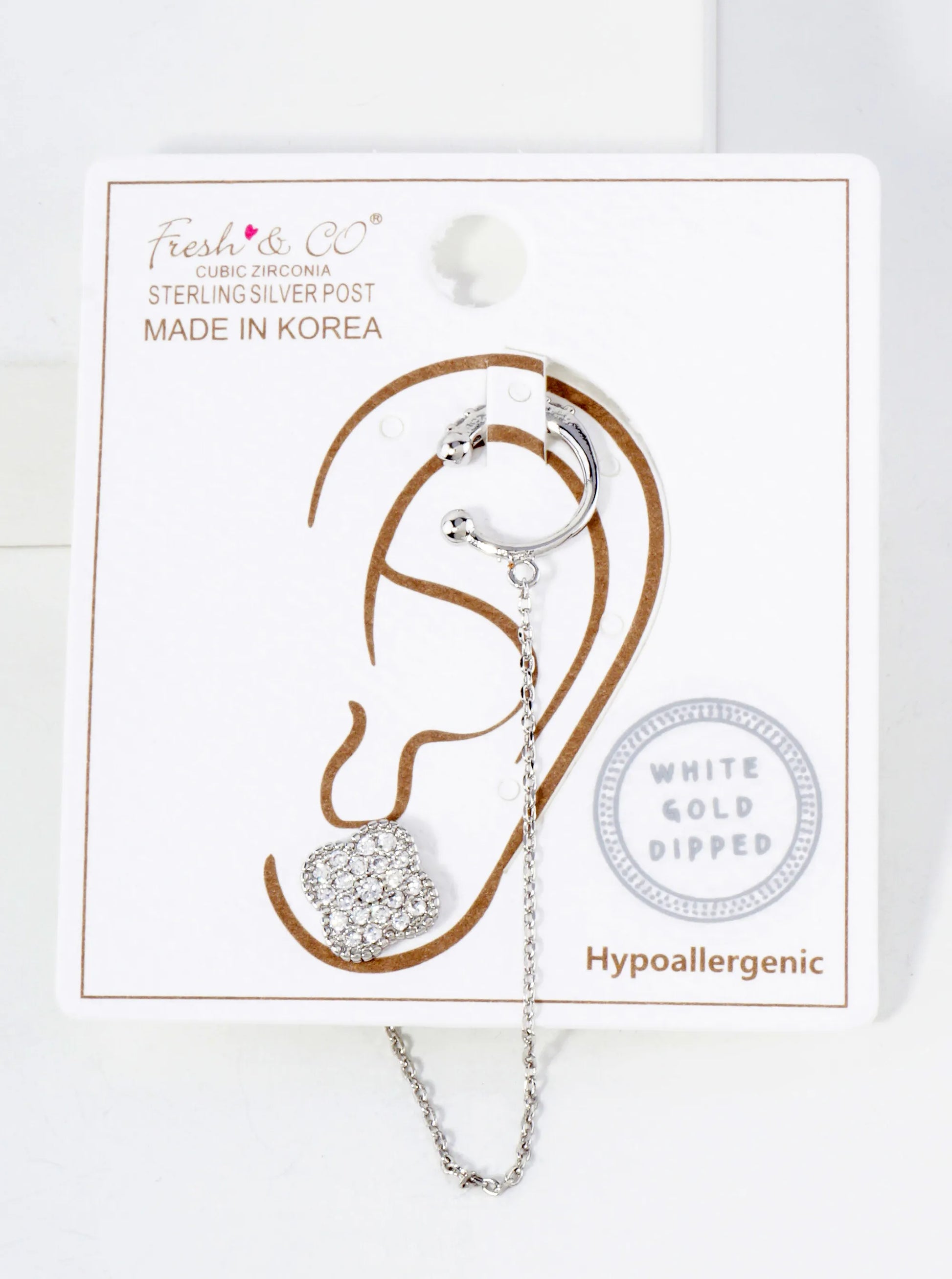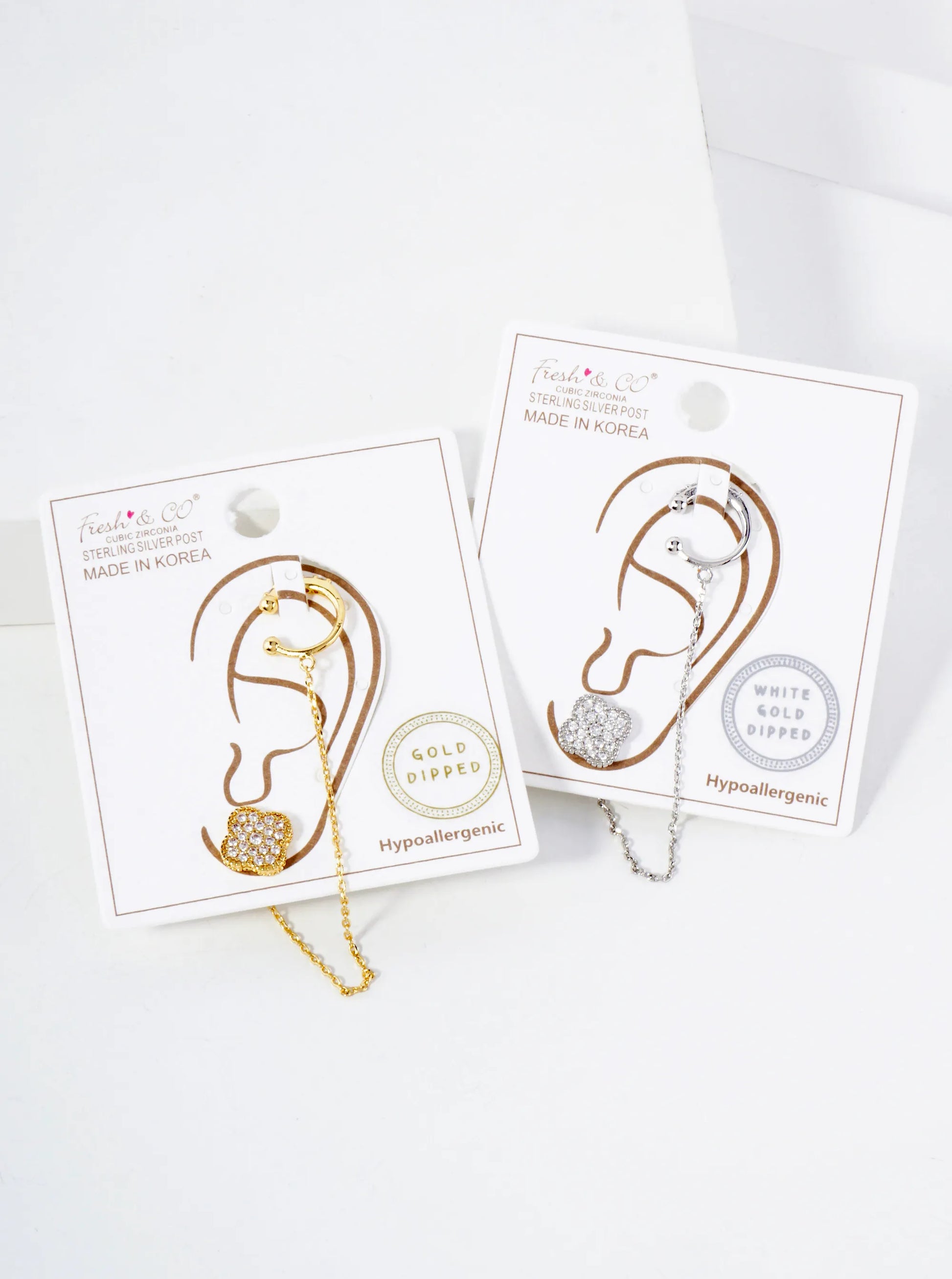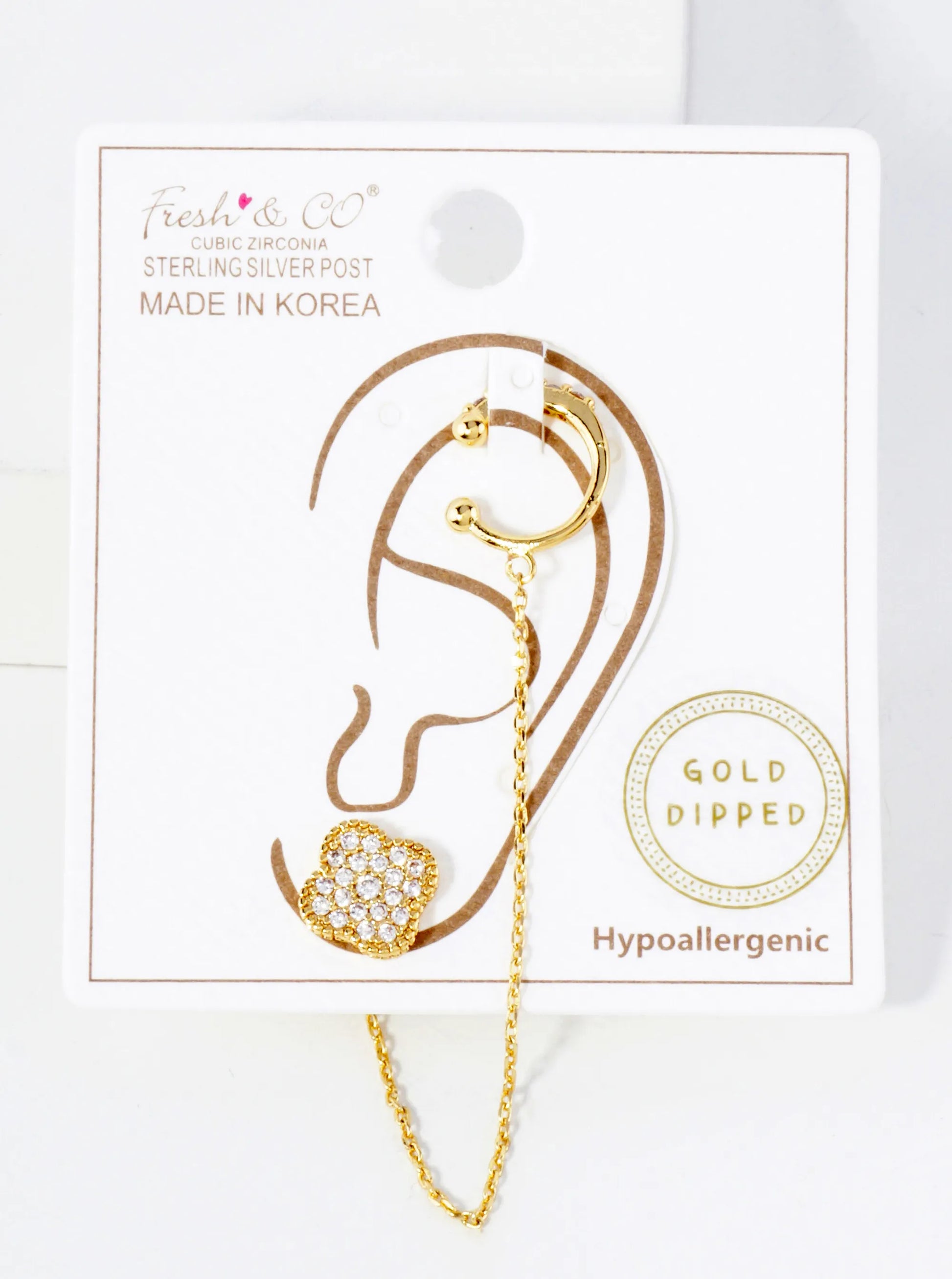 10mm Pave-Set CZ Quatrefoil Stud And Ear Cuff Drape Chain 18K-Gold-Dipped Earring Set
