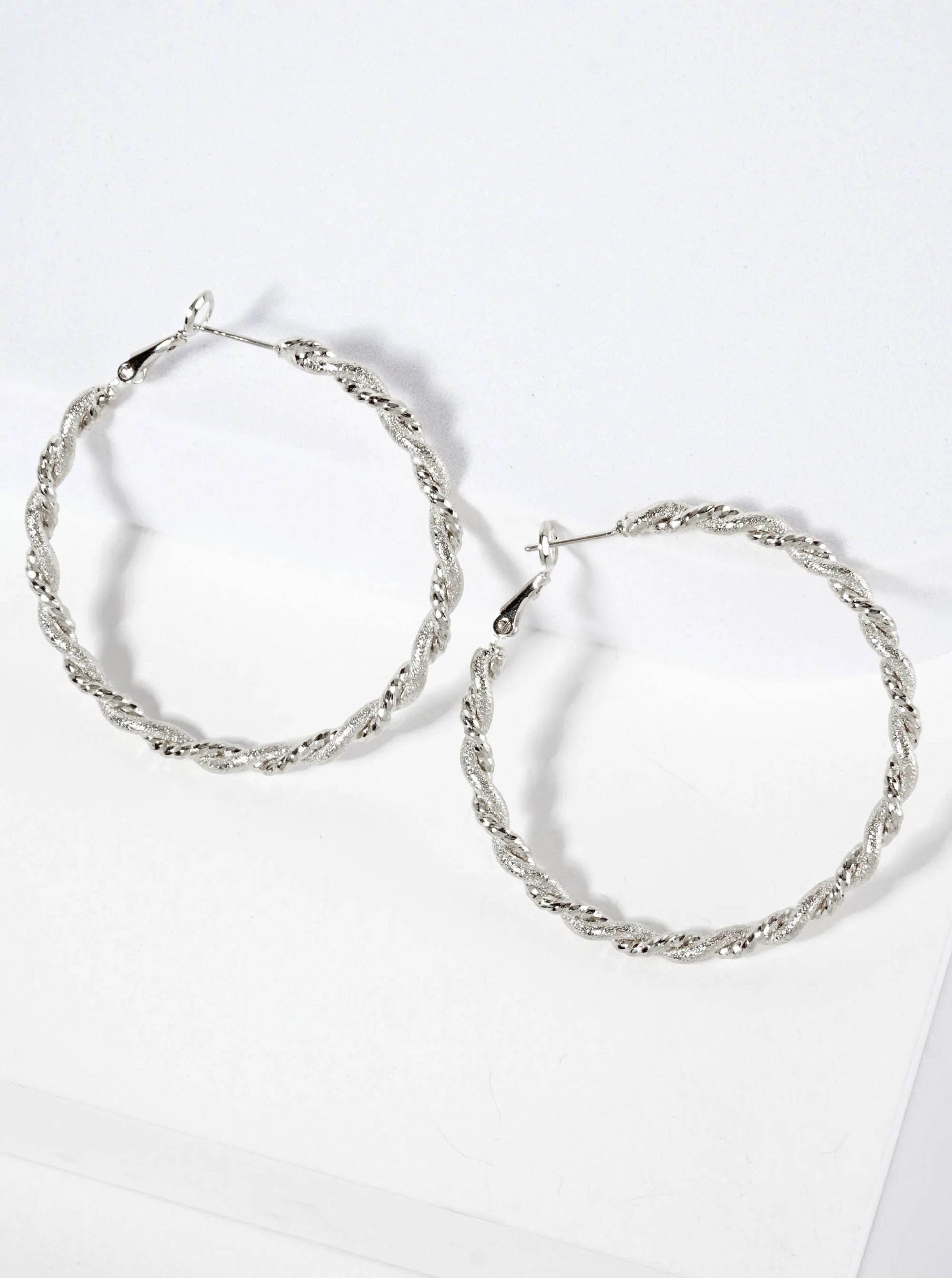 These Bold And Elegant Earrings Showcase A 50mm Diameter, Making Them A Striking Statement Piece. The Twist Design Adds A Dynamic, Sculptural Element, While The Shimmer-textured Finish Enhances Their Radiance With A Touch Of Sparkle. Equipped With A Secure Latch Back Closure, These Hoops Are Comfortable To Wear And Perfect For Elevating Both Casual And Formal Outfits With A Modern Flair.