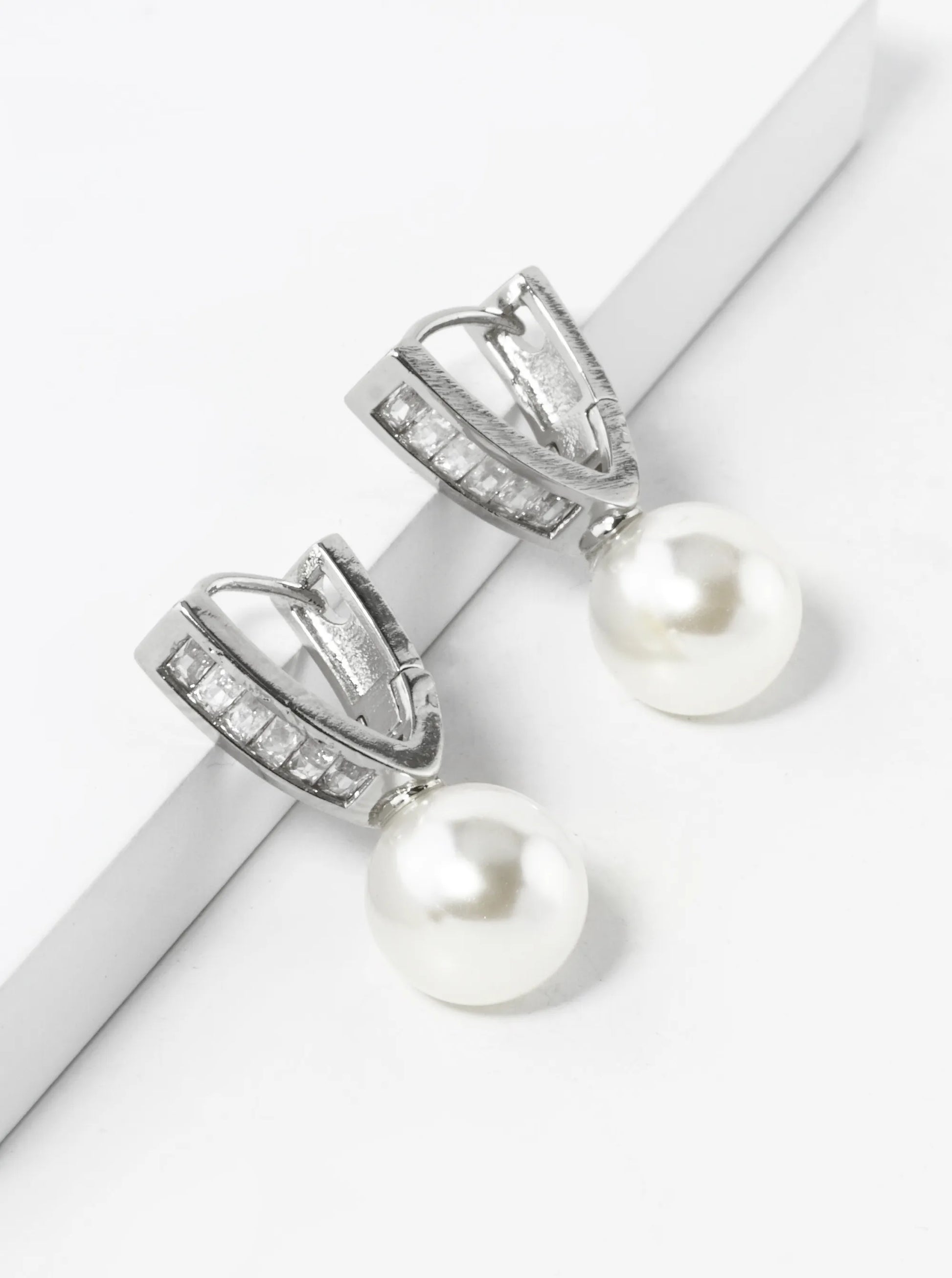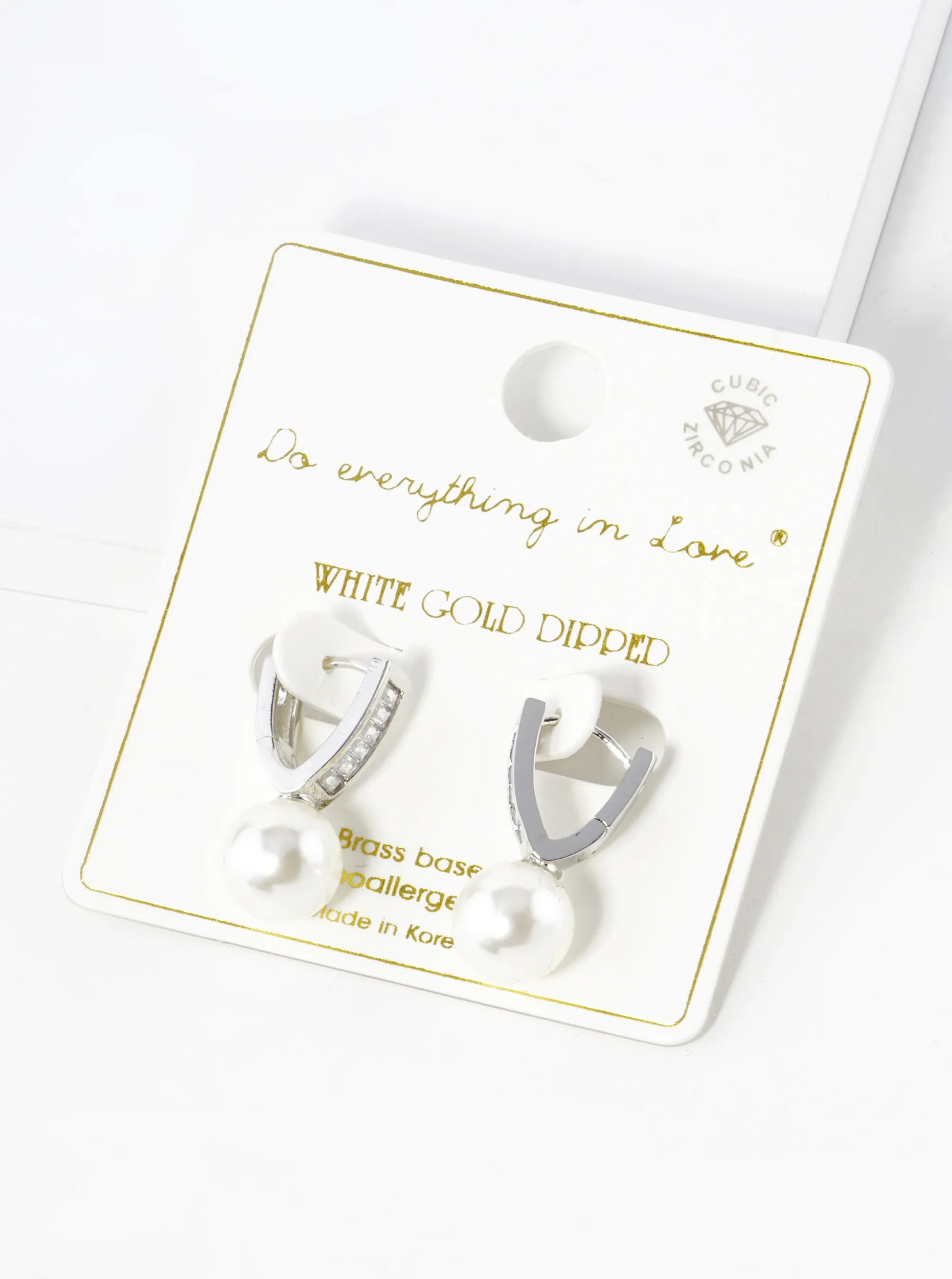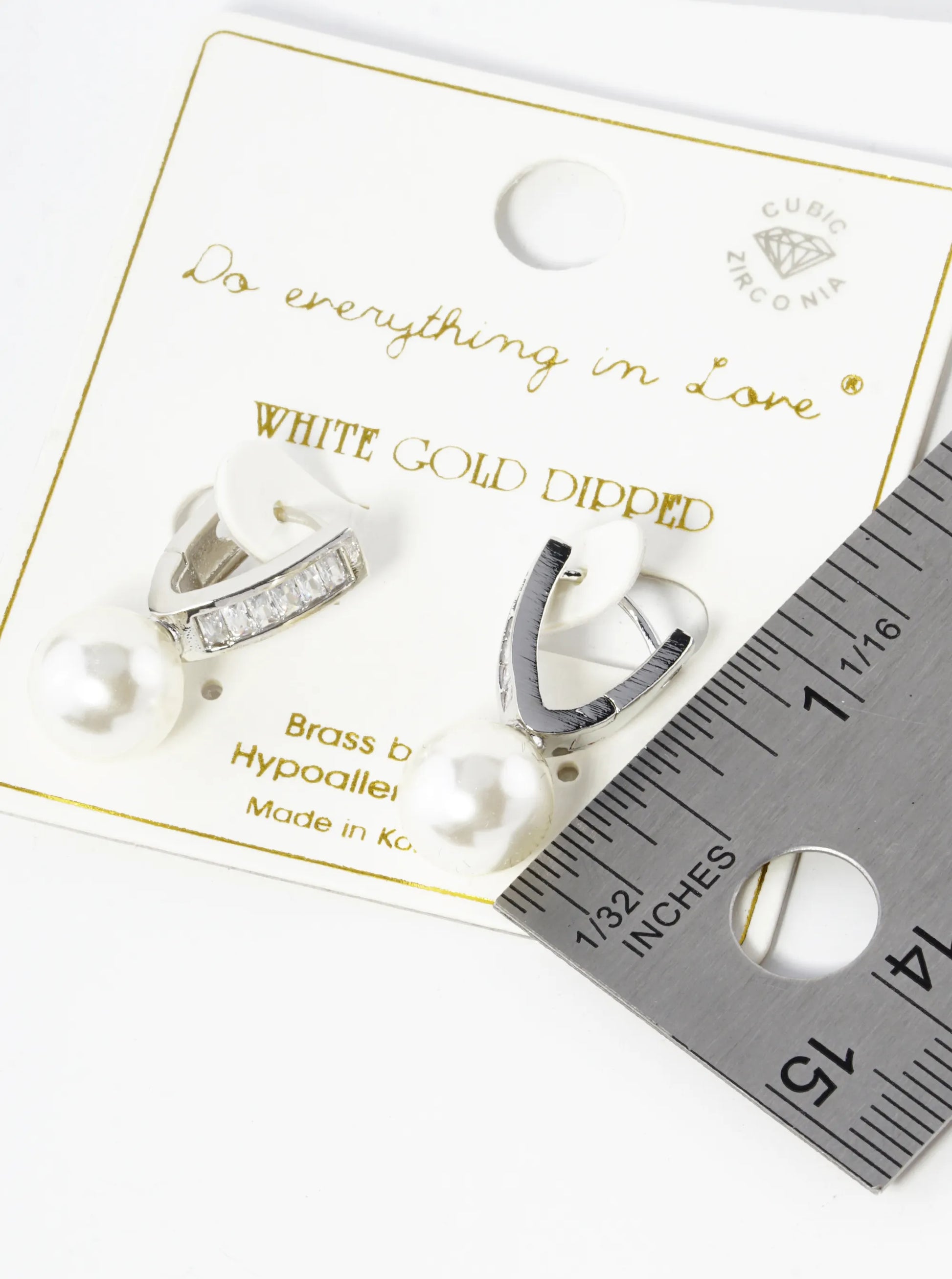 14K Gold Dipped 9mm Pearl Drop Baguette CZ Pave Huggie Hoop Earrings