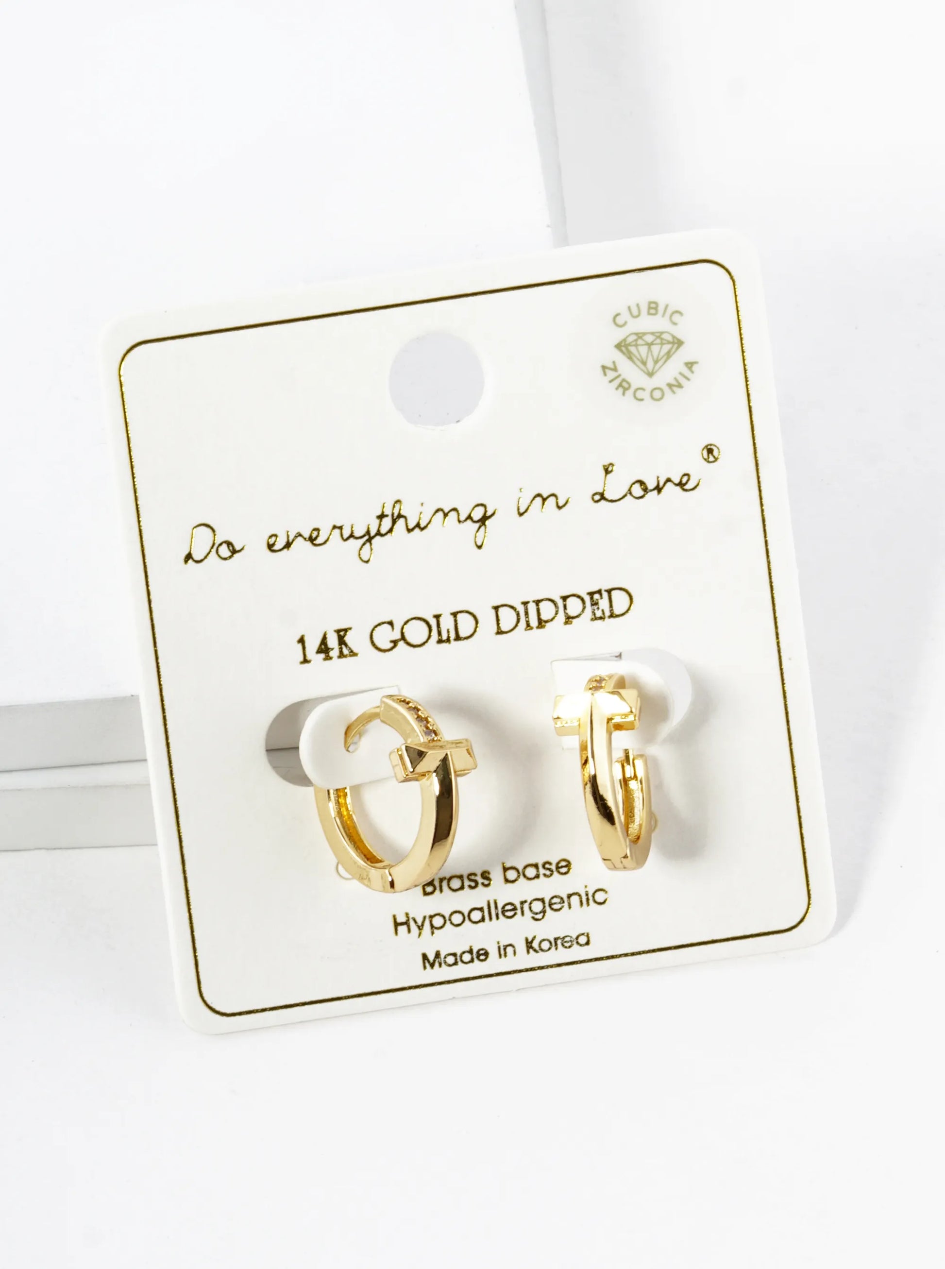 14K Gold Dipped CZ Pave Cross Huggie Hoop Earrings