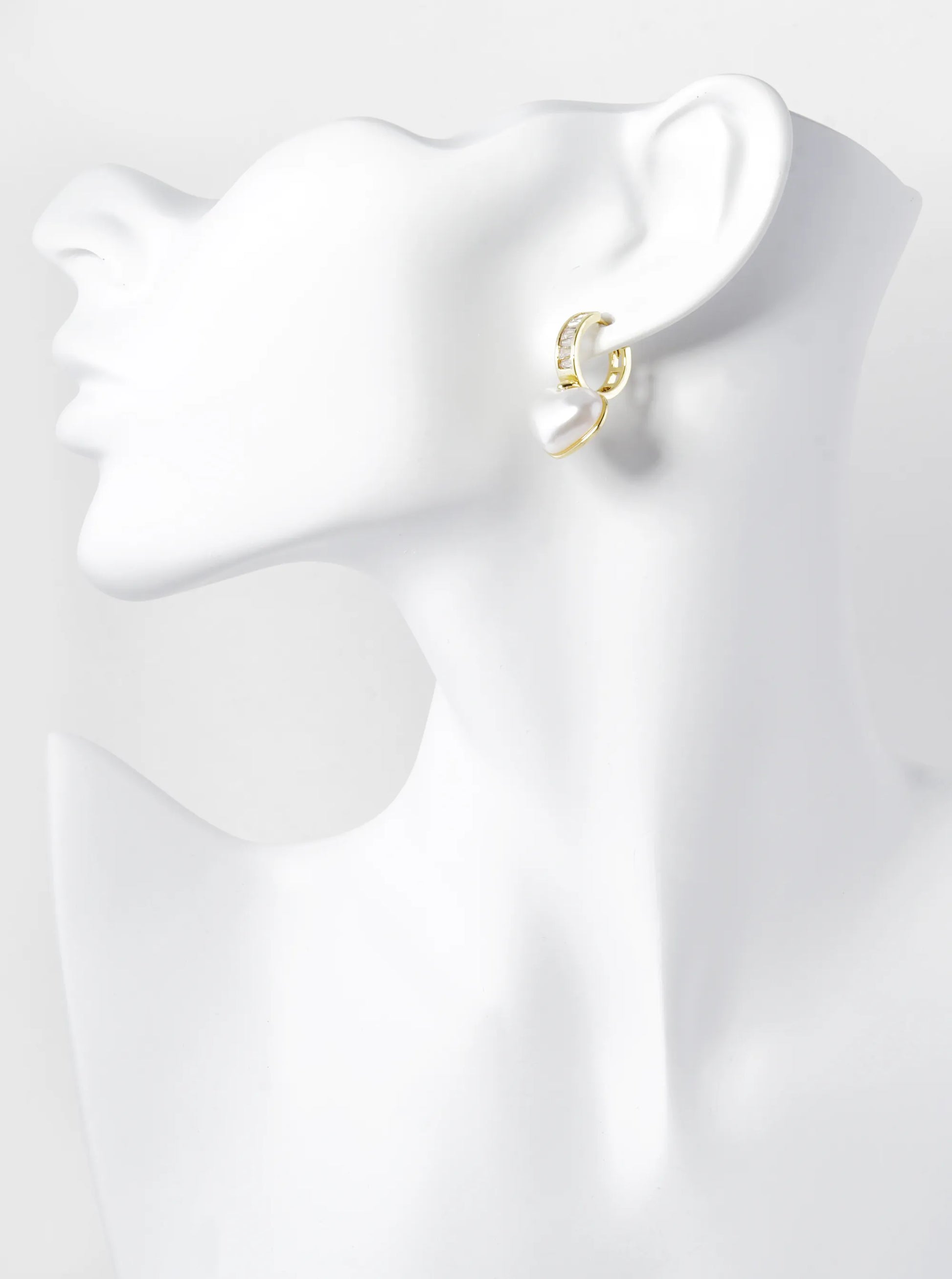 14K Gold Dipped Pearl Heart Drop 13mm Baguette Cubic Zirconia Huggie Hoop Earrings
