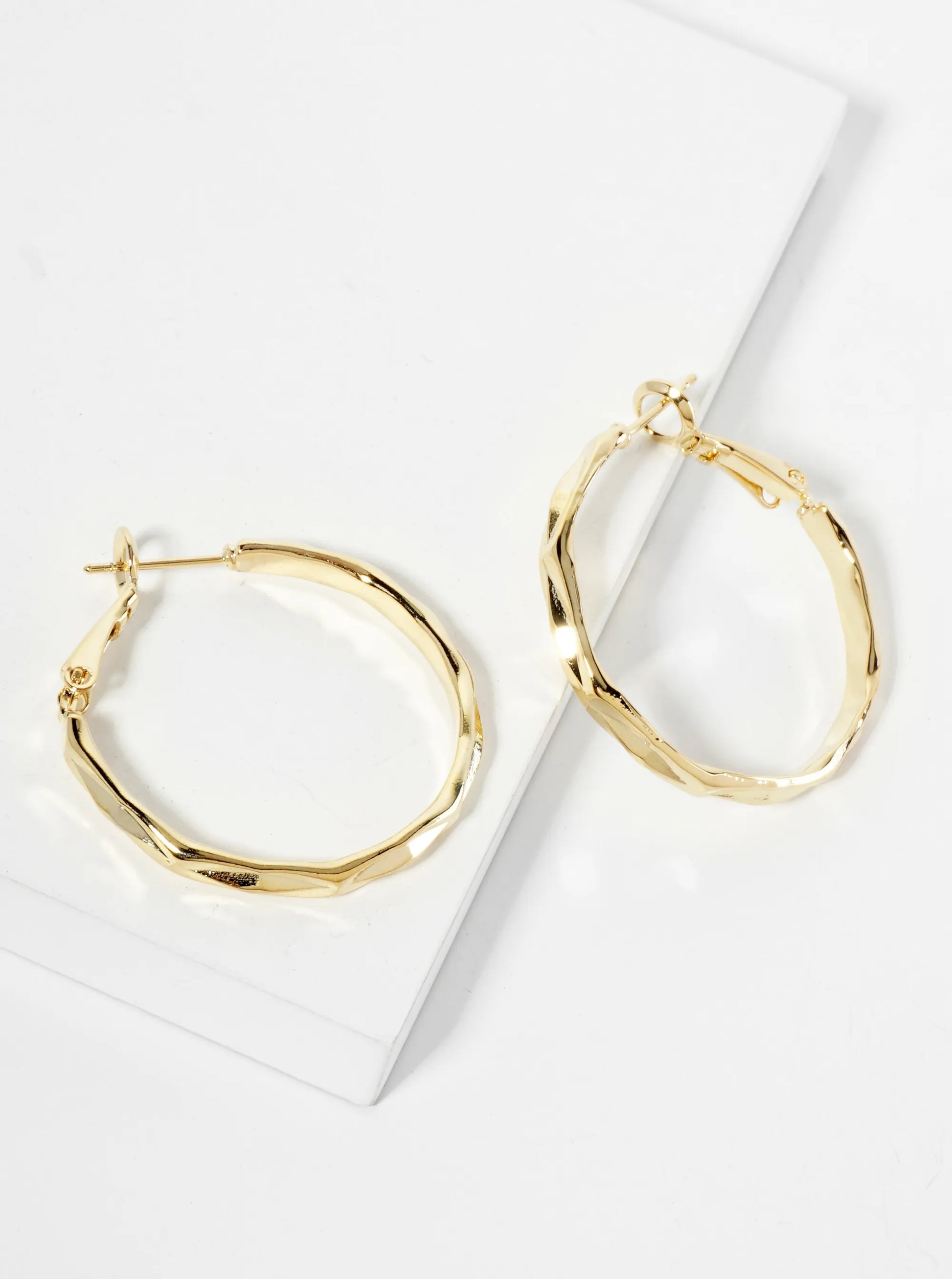 These Earrings Are A Striking Blend Of Classic Design And Modern Texture. These Earrings Feature A 30mm Hoop With A Faceted Surface That Creates An Elegant Geometric Pattern, Giving The Earrings A Multifaceted, Dynamic Look. The Polished Metal Finish Enhances The Texture, Reflecting Light In A Subtle Yet Captivating Way.