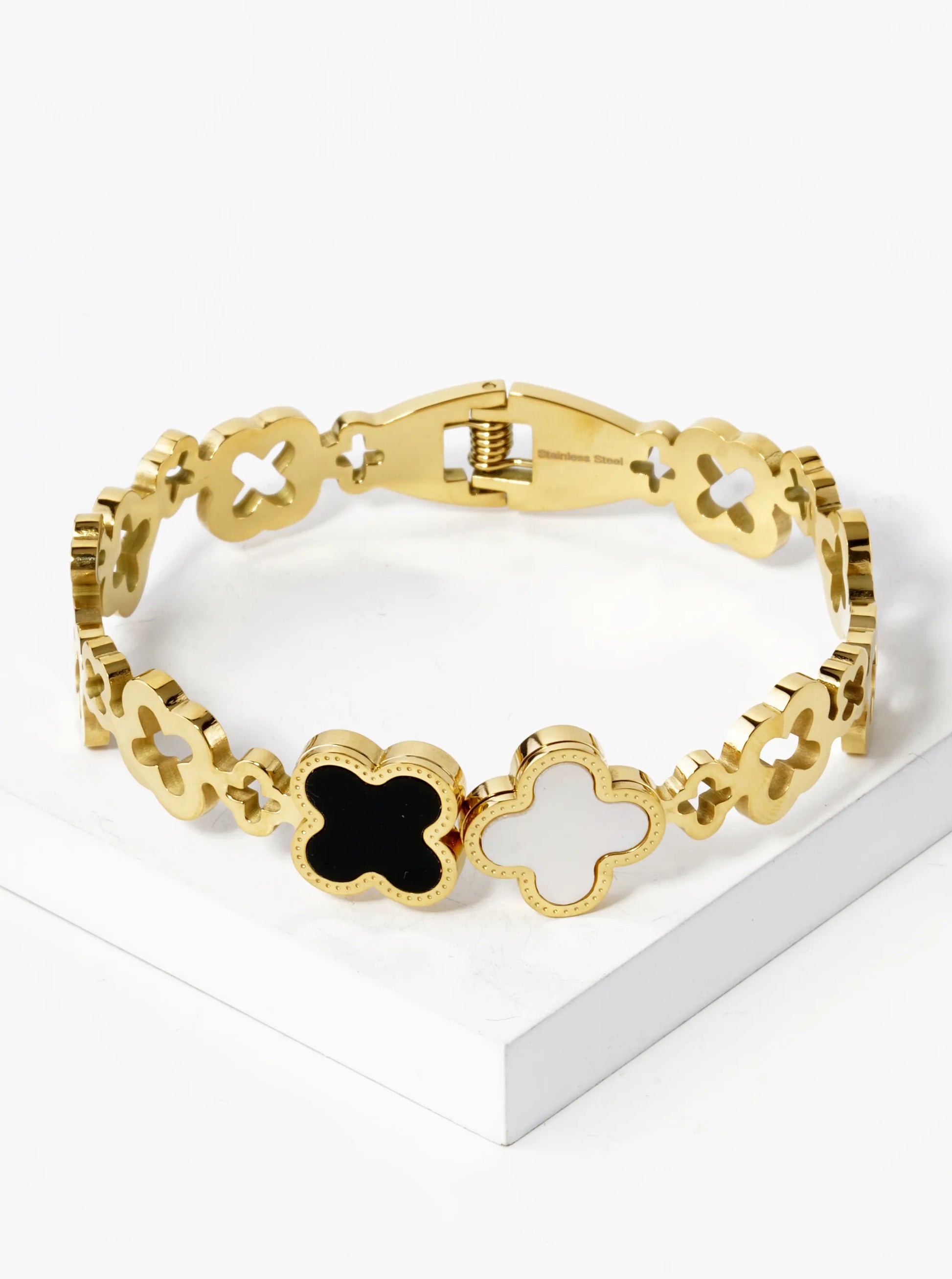 15mm MOP Quatrefoil Accent 10mm Thick Cutout Open Bangle Bracelet