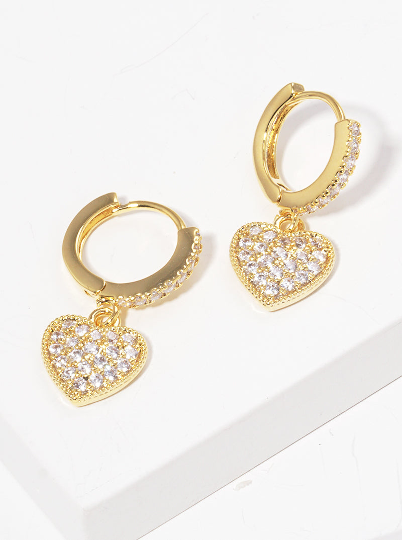 18K Gold Dipped 10mm CZ Pave Huggie Hoop Earrings With Heart Drop