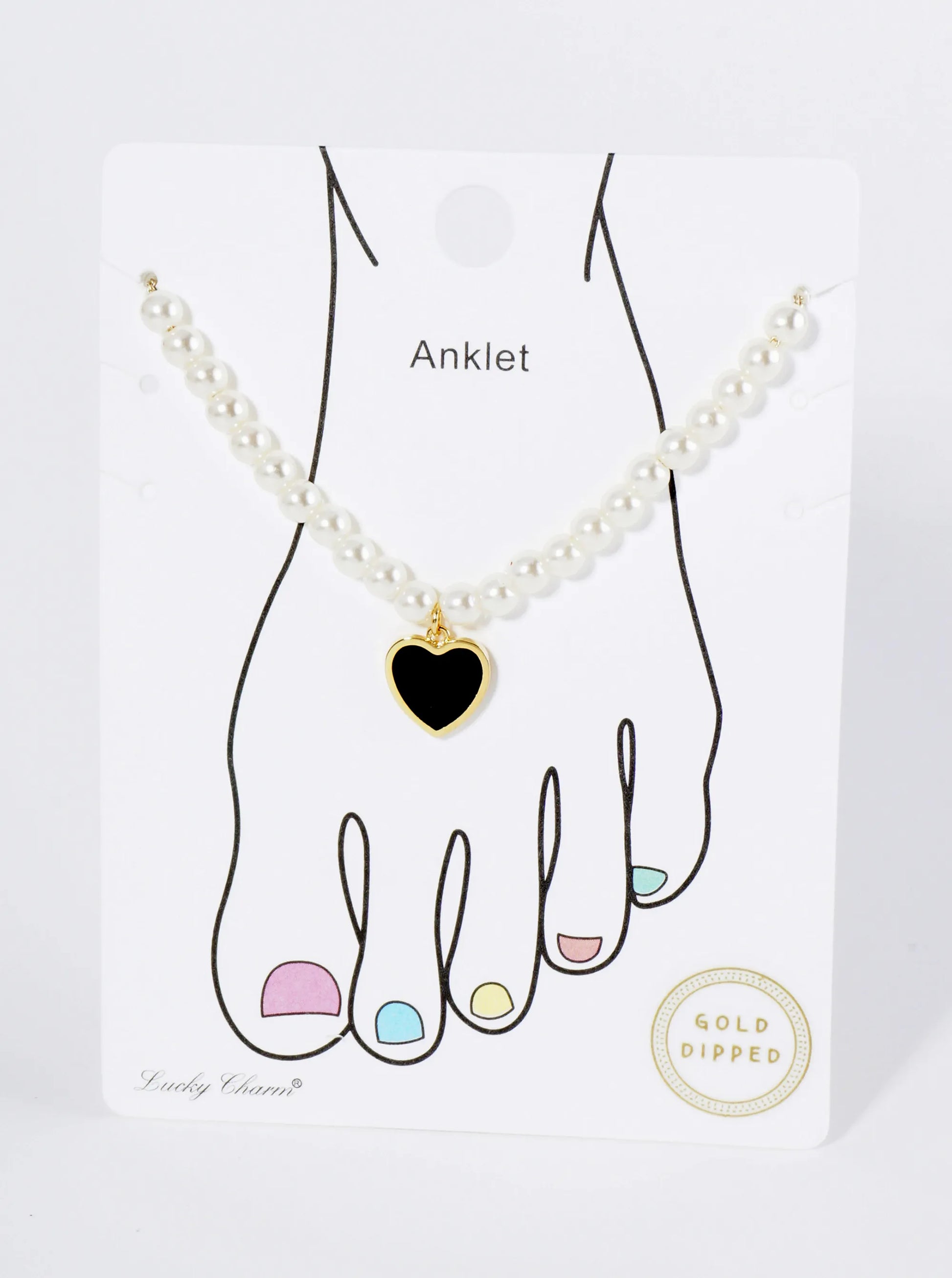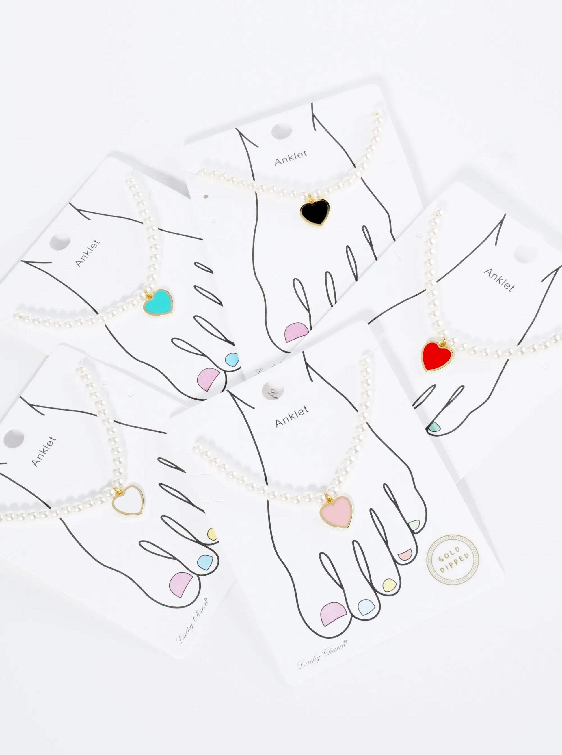 18K Gold Dipped 10mm Enamel Heart Charm Pearl Chain Anklet