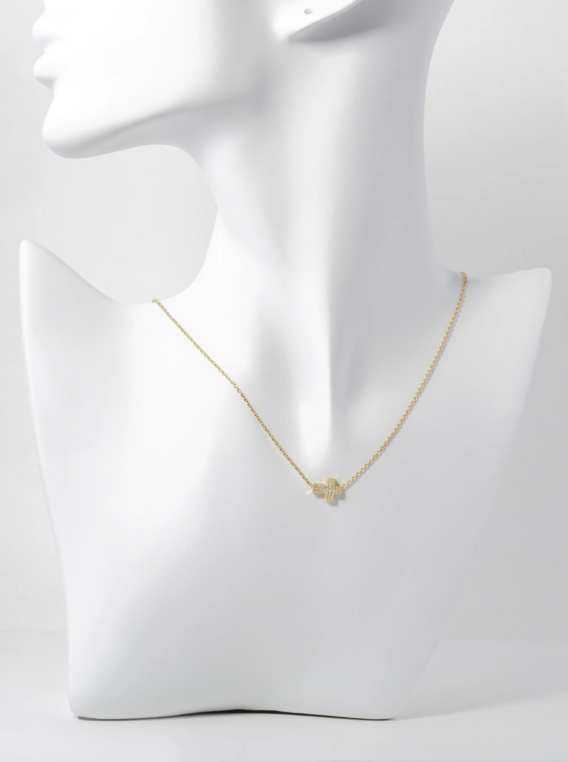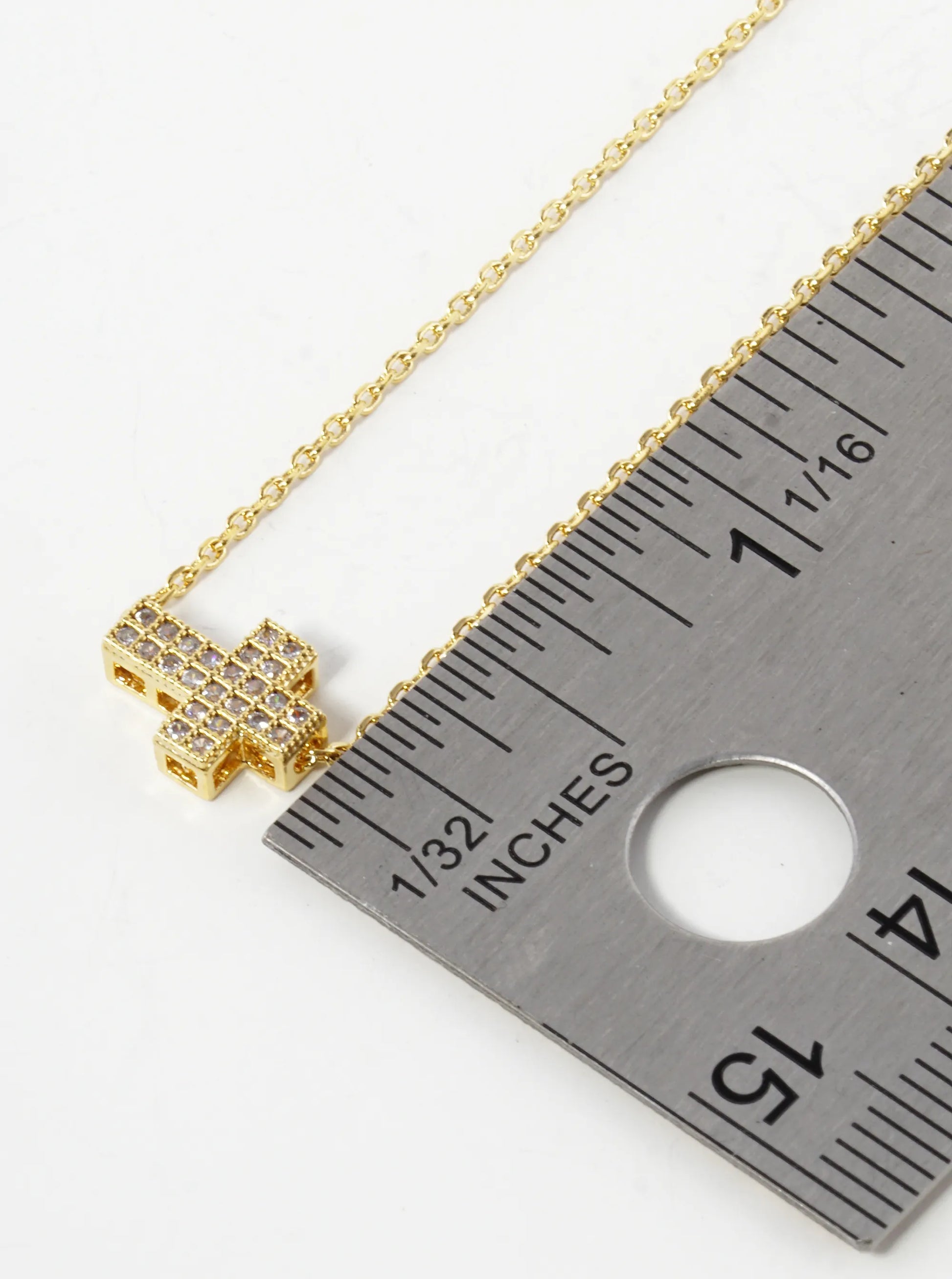 At The Center Of The Necklace Is A Sideways Cross-shaped Pendant, Measuring 10mm In Size. The Surface Of The Cross Is Adorned With Pave Cubic Zirconia Stones, Intricately Set To Create A Radiant And Shimmering Effect. The Pave Setting Technique Involves Closely Placing Small Stones To Cover The Entire Surface Of The Pendant, Resulting In A Dazzling Display Reminiscent Of Diamonds.