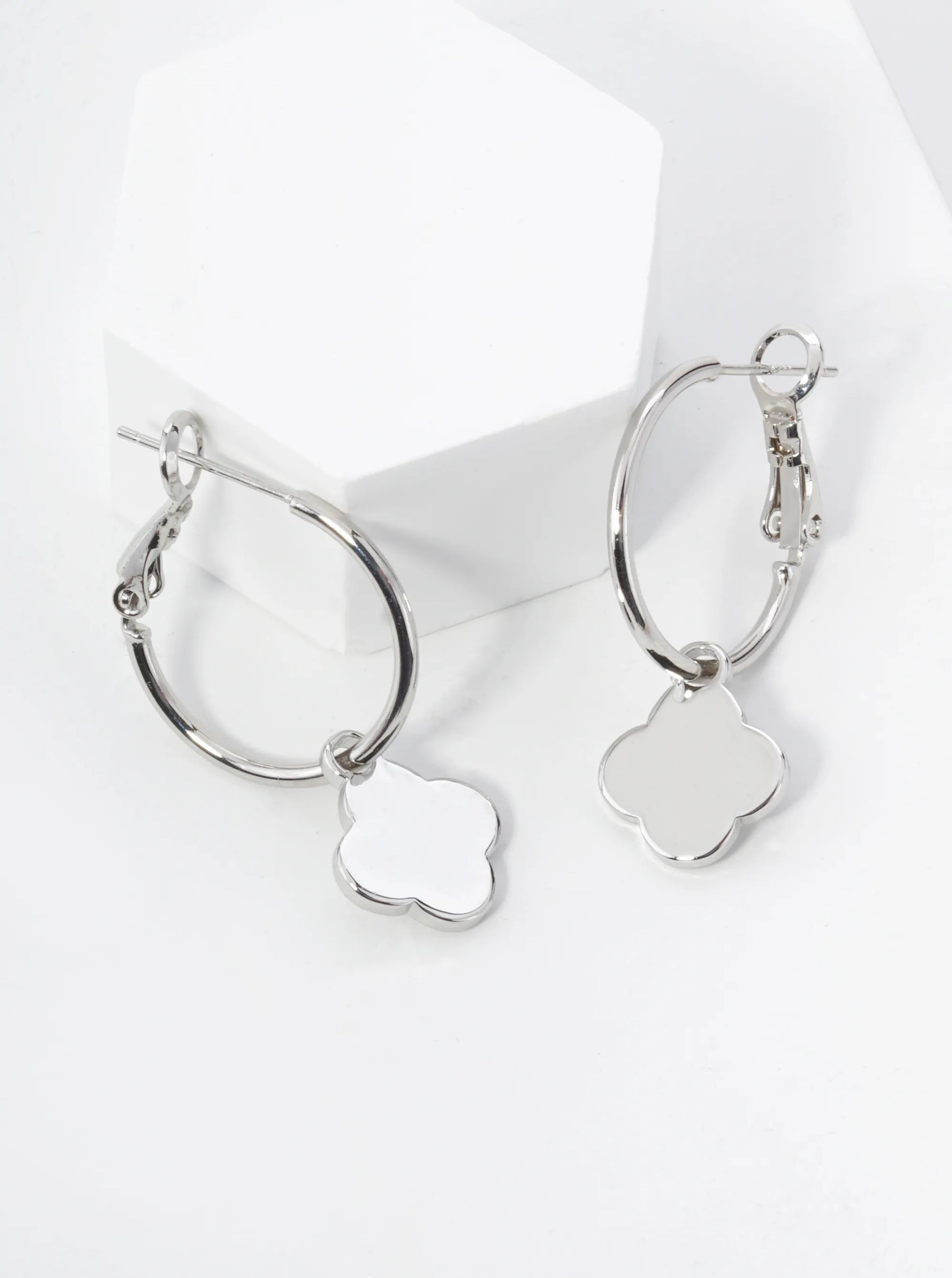 These Earrings Feature A Stunning Quatrefoil Drop Design With A Diameter Of 12mm, Plated In 18K Gold For A Luxurious Finish. They Are Elegantly Suspended From Leverback Hoop Earrings Measuring 20mm In Diameter. The Combination Of The Intricate Quatrefoil Pattern And The Classic Hoop Style Creates A Sophisticated And Timeless Accessory.