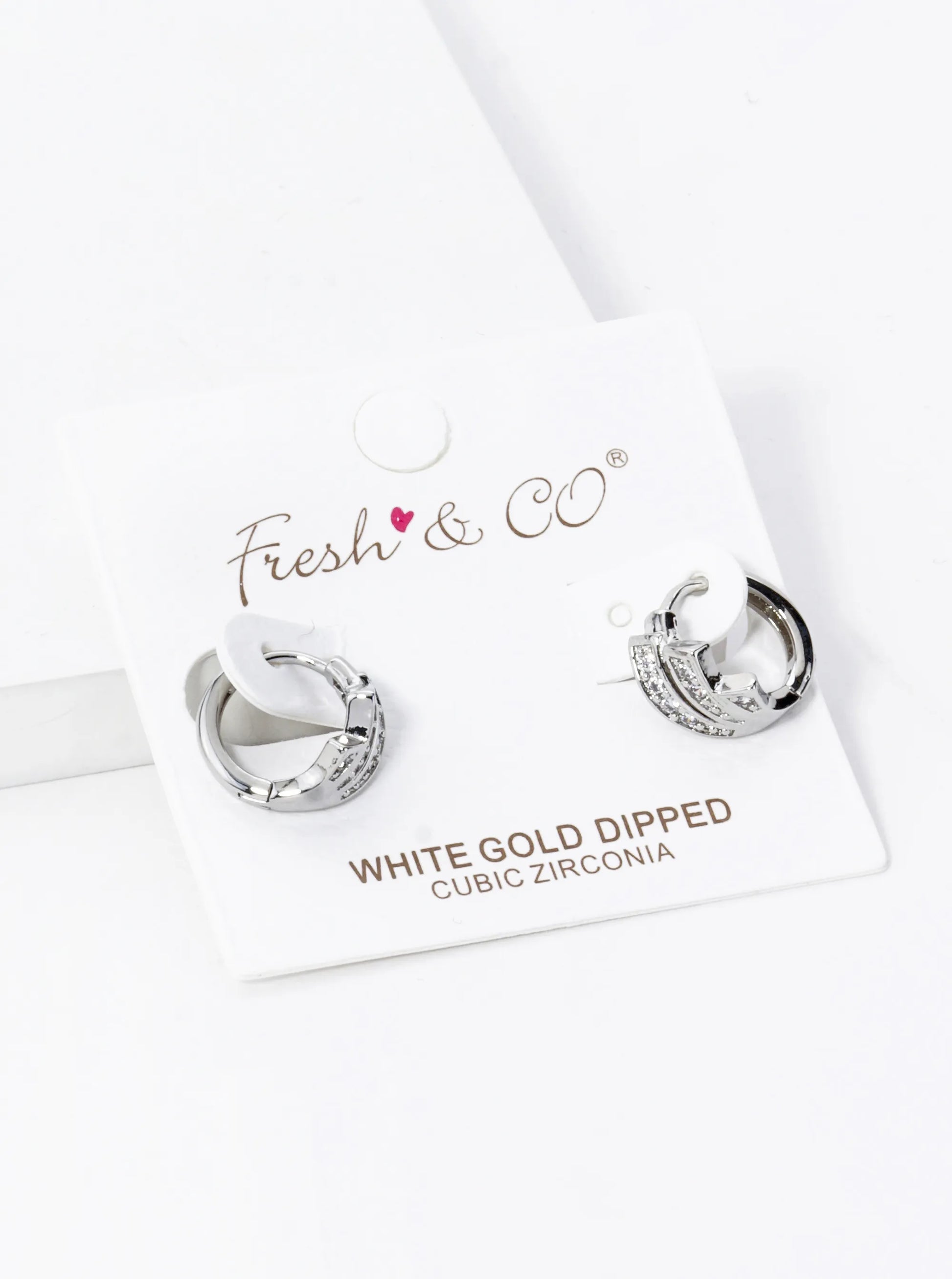 18K Gold Dipped 3 Line Cubic Zirconia 12mm Huggie Hoop Earrings