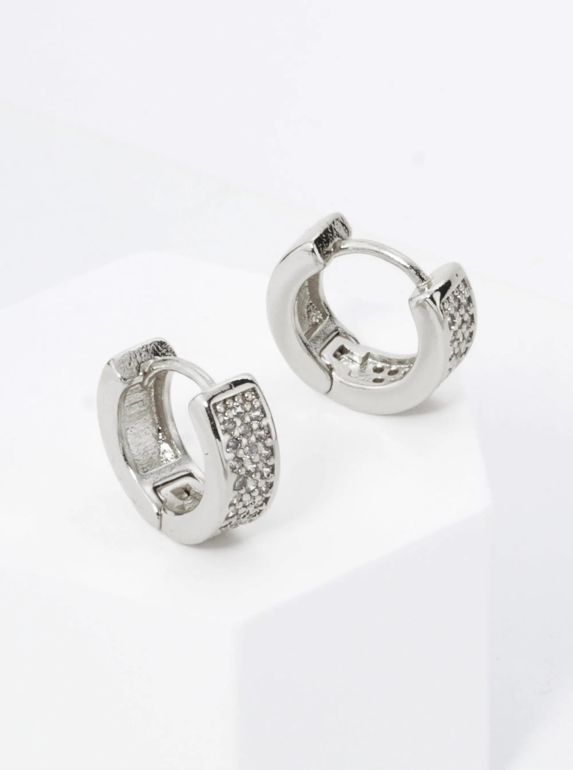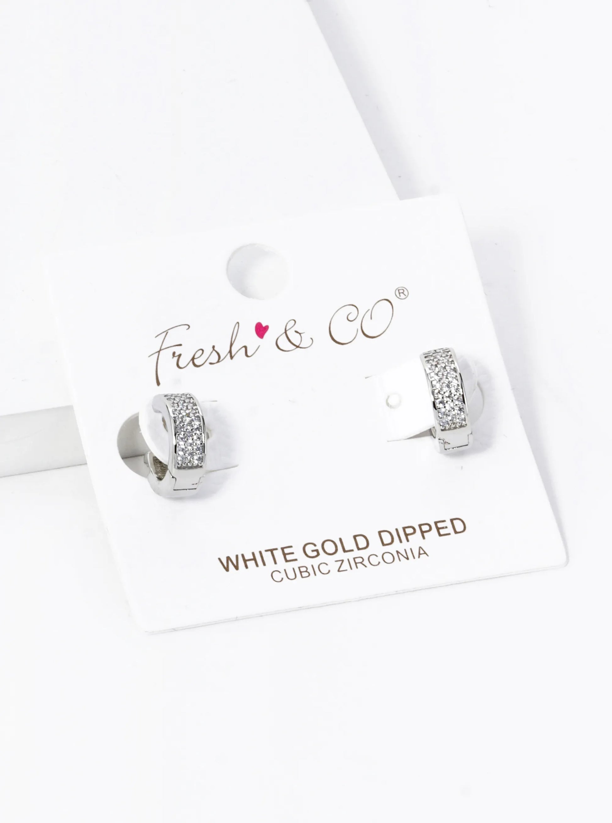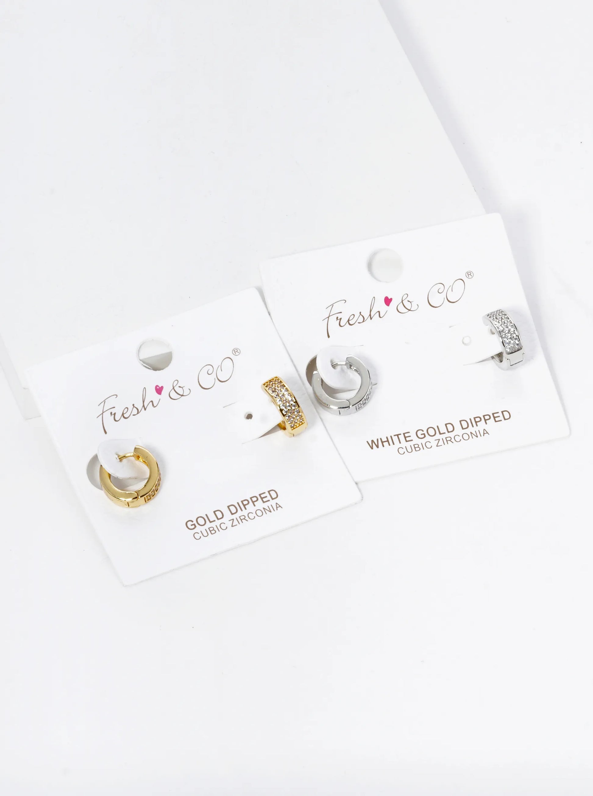 Elevate Your Style With These 18K Gold Dipped Huggie Hoop Earrings, Featuring A Three-line Micro Pave Set Of Sparkling Cubic Zirconia Stones. The Brass Base Adds Durability, While The Gold And Rhodium Plating Adds A Touch Of Luxury—a Must-have Accessory For Any Outfit.