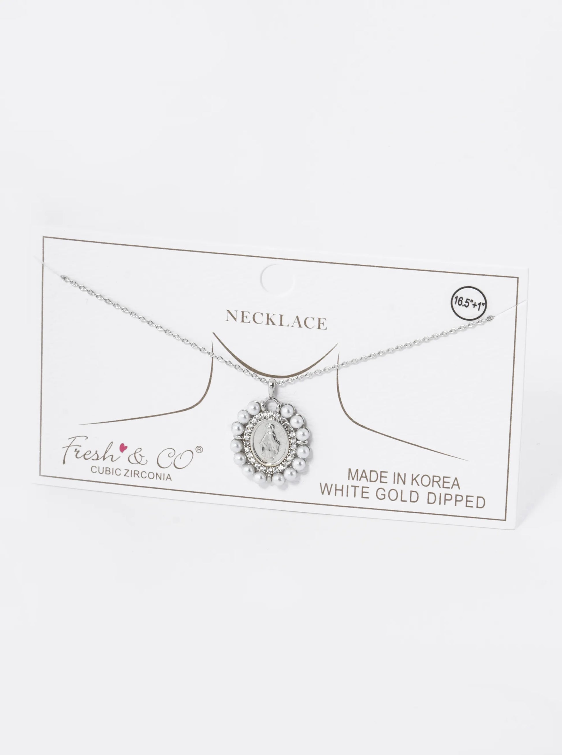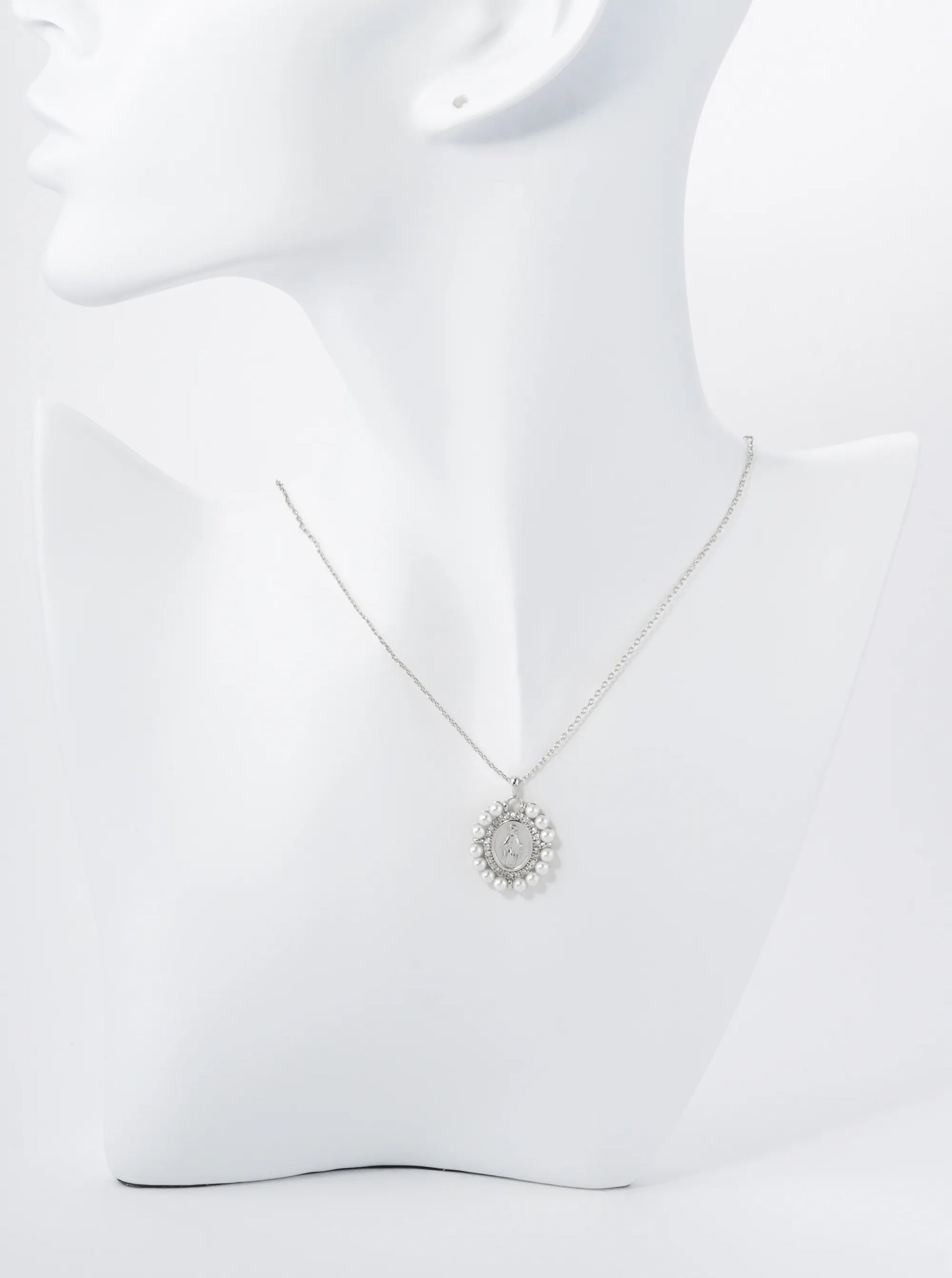 18K Gold Dipped 3mm Pearl Beaded CZ Oval Miraculous Medal Pendant Religious Necklace