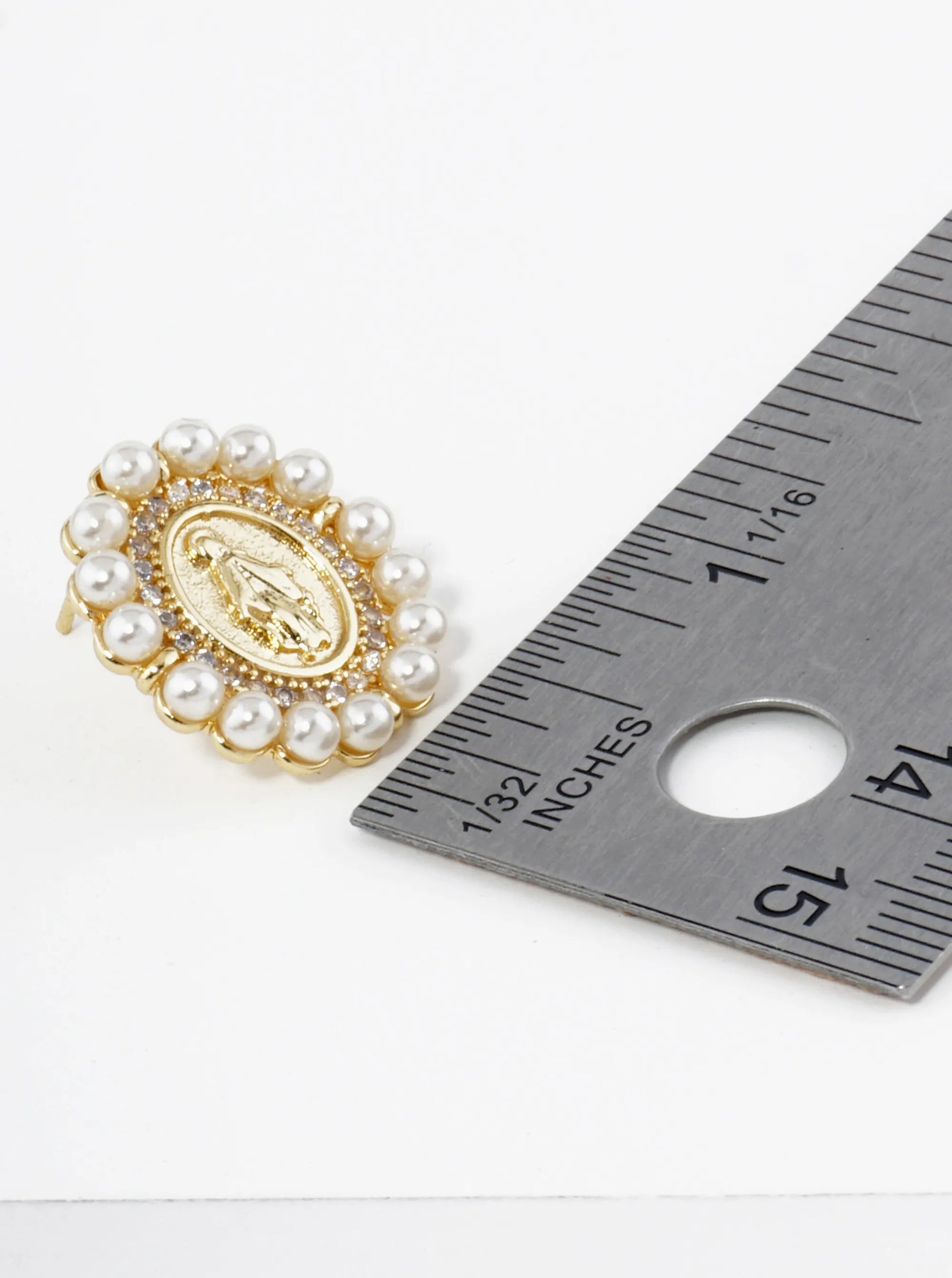 18K Gold Dipped 3mm Pearl Beaded CZ Oval Miraculous Medal Stud Earrings