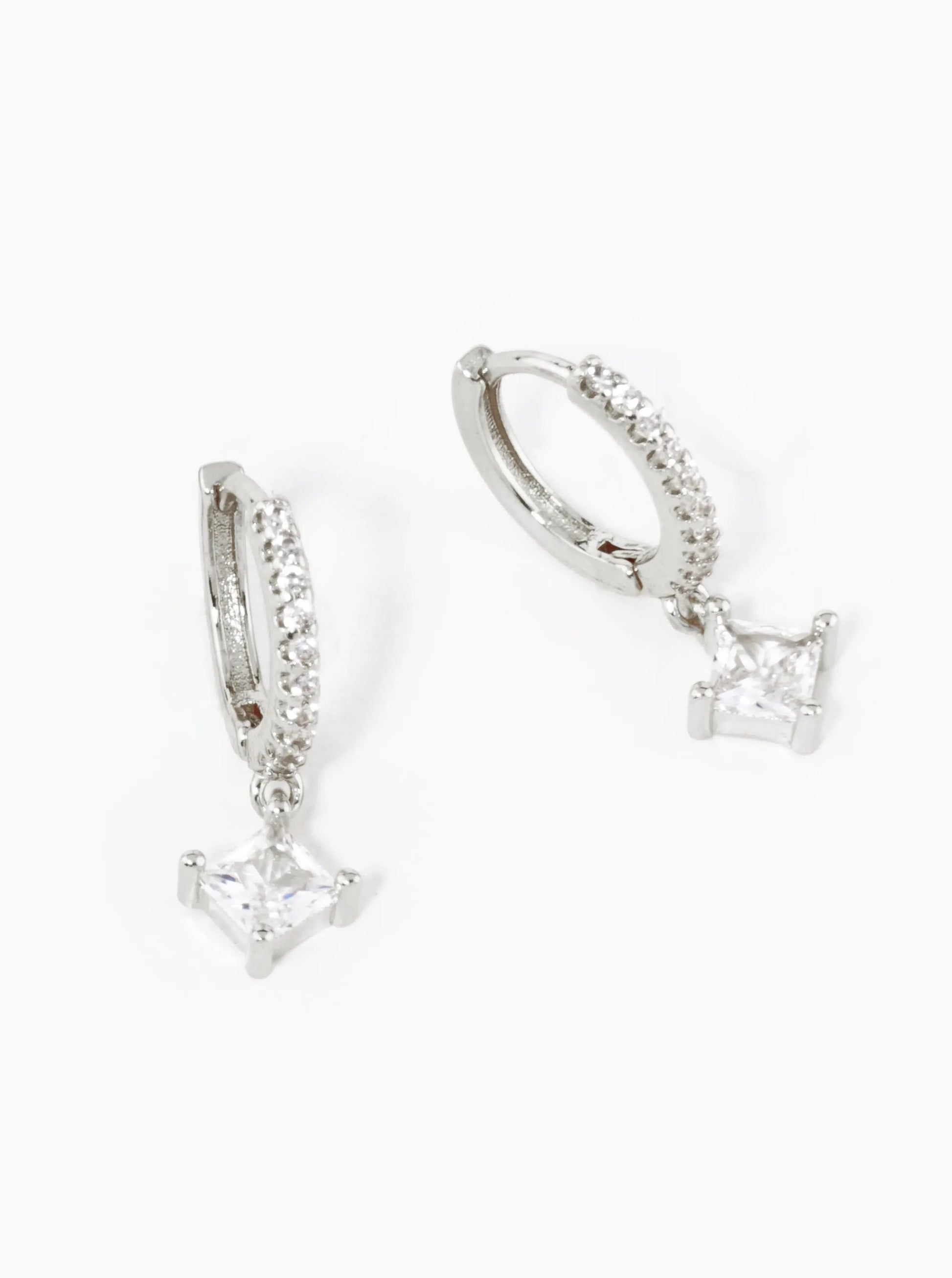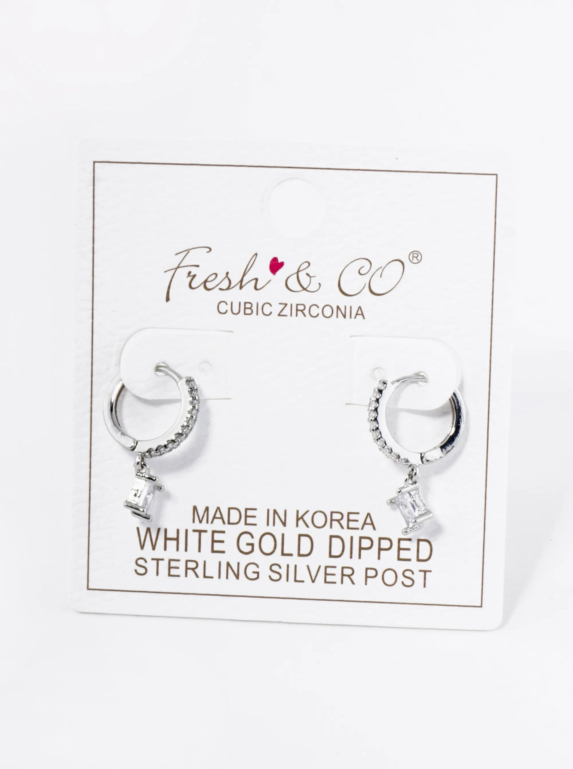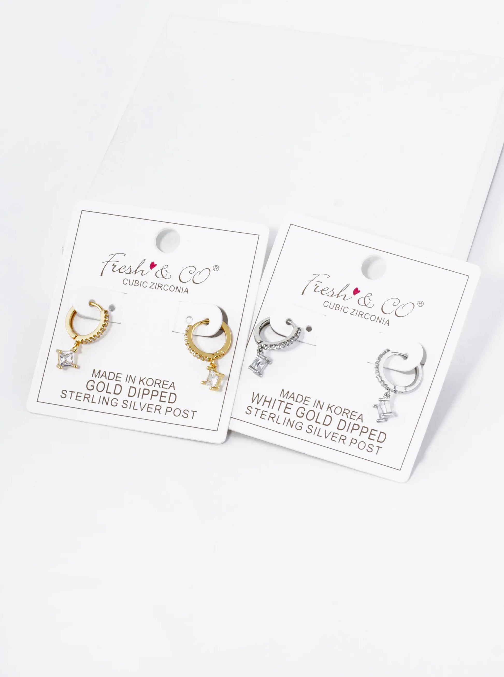 These Earrings Feature A Classic Huggie Hoop Design Adorned With Square-cut Cubic Zirconia Drops. The Cubic Zirconia Stones Are Securely Held In Place By Four-prong Settings, Adding A Modern And Sleek Touch To The Earrings. The Square Shape Of The Cubic Zirconia Stones Adds A Contemporary Edge To The Design, Making These Earrings Both Versatile And Chic.