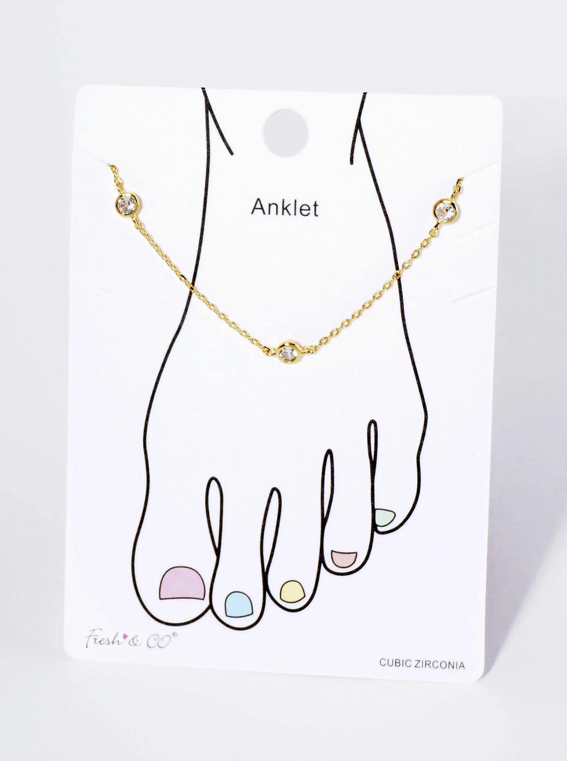 18K Gold Dipped 4mm Five Bezel Set Cubic Zirconia Stone Brass Chain Anklet