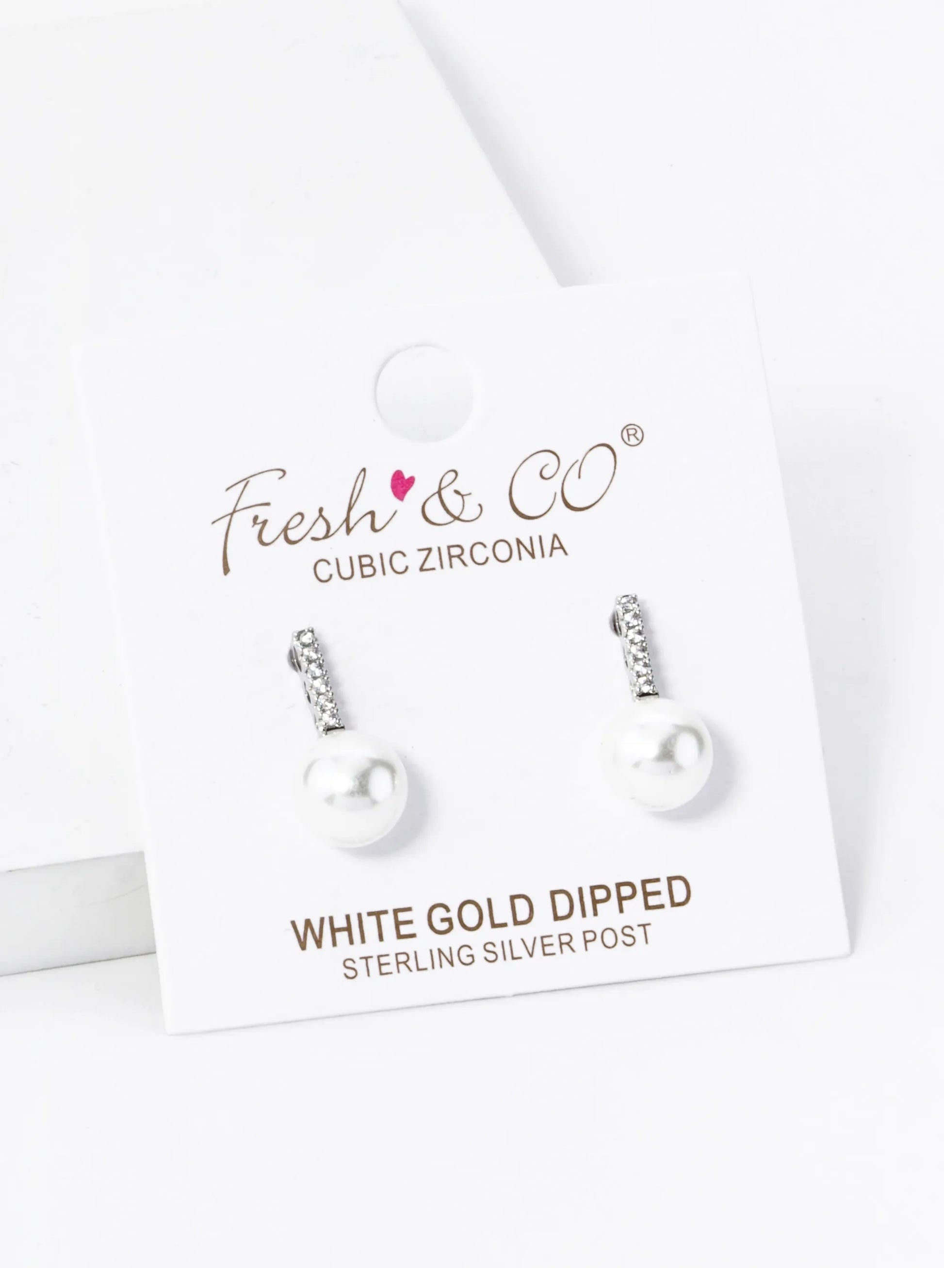 18K Gold Dipped 7mm Pearl Drop Pave Cubic Zirconia Bar Post Stud Earrings