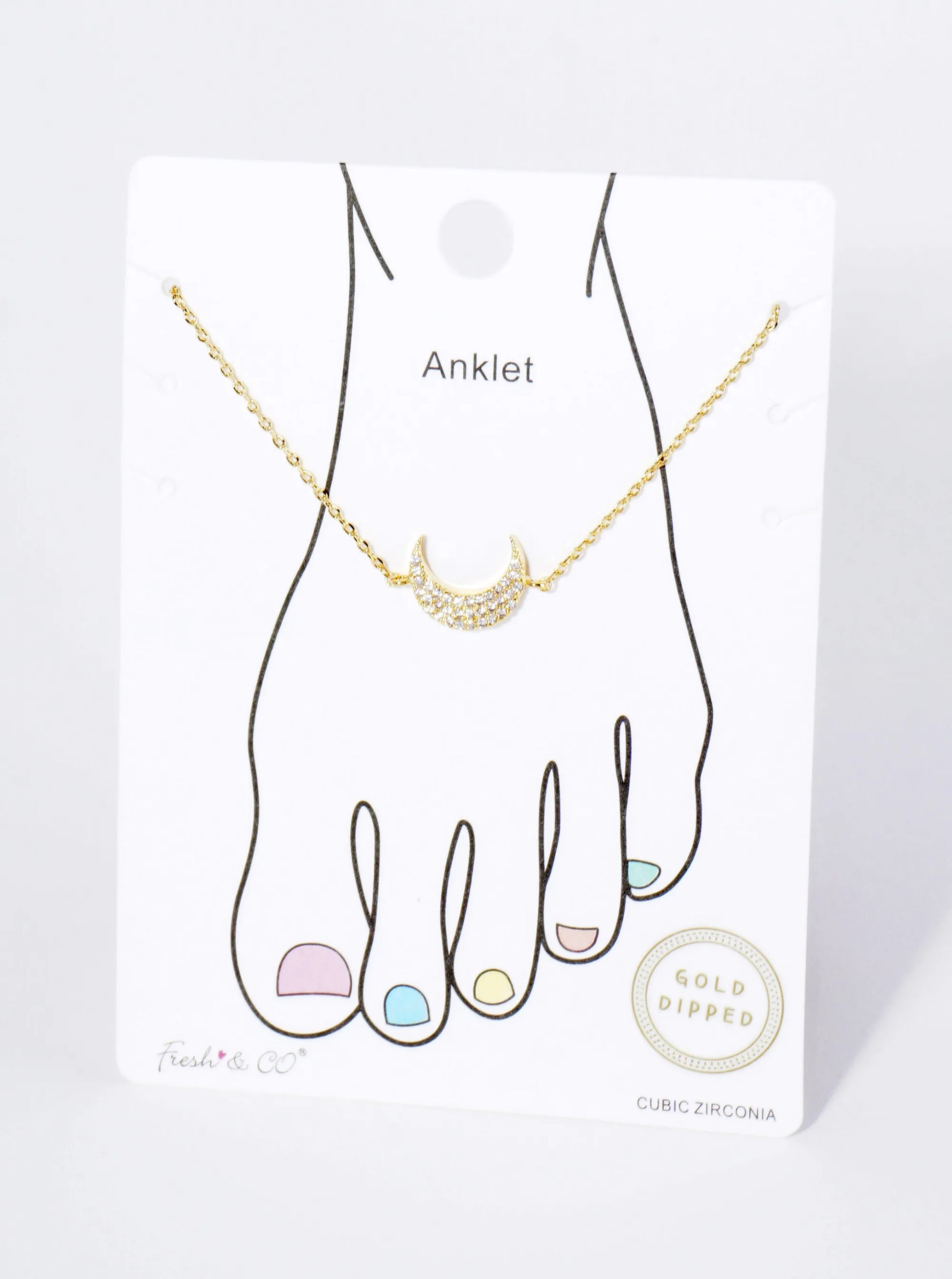 18K Gold Dipped 9mm Cubic Zirconia Pave Crescent Moon Brass Chain Anklet