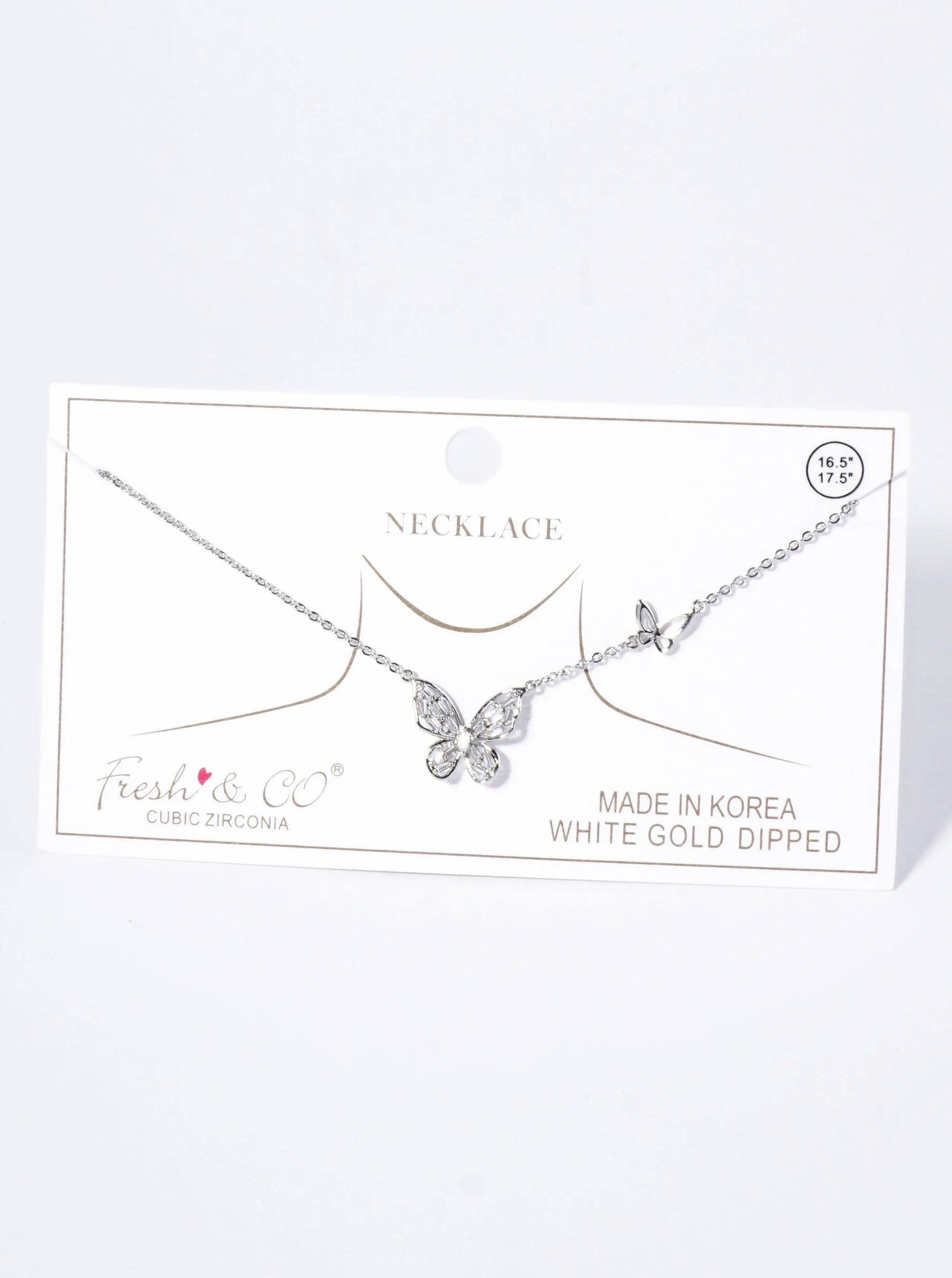 The Necklace Is A Stunning And Whimsical Piece That Combines Elegance With Playful Charm. The Centerpiece Is A Beautifully Crafted Butterfly Pendant, Where Each Wing Is Adorned With Baguette-cut Cubic Zirconia (CZ) Stones. These CZ Stones Are Precisely Arranged To Mimic The Delicate And Intricate Patterns Of A Butterfly’s Wings, Creating A Sparkling, Light-catching Effect.