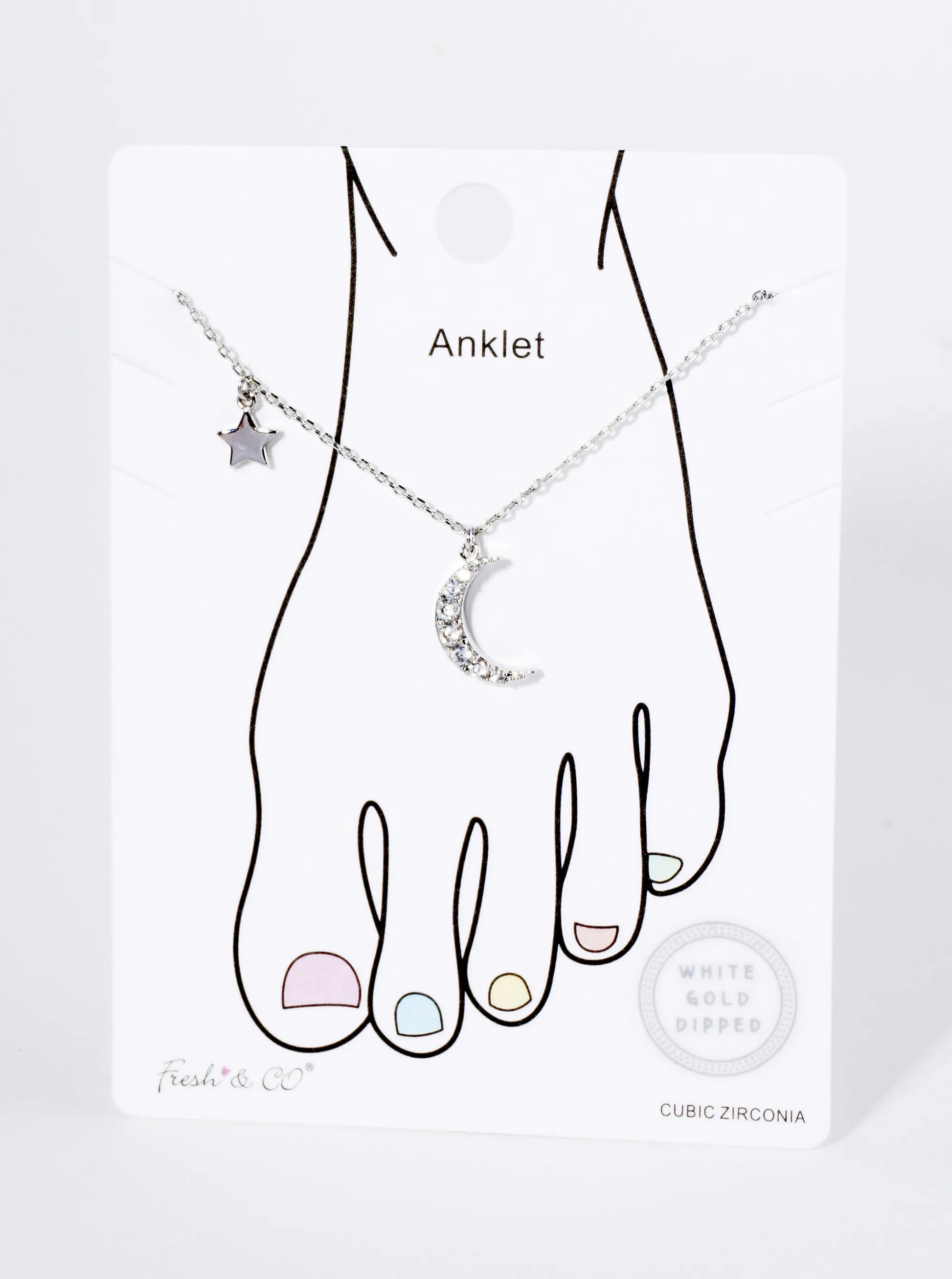 18K Gold Dipped Cubic Zirconia Pave Crescent Moon And Star Brass Chain Anklet