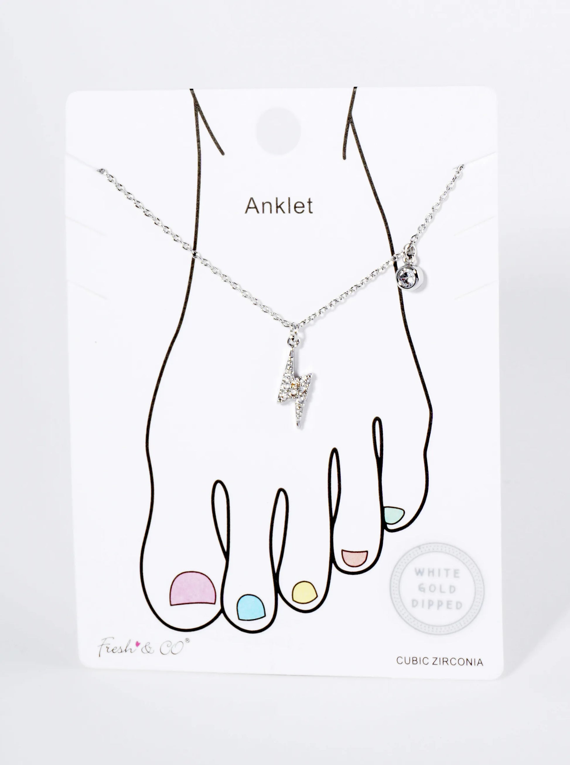 The Focal Point Of The Anklet Is A Lightning Bolt Charm, Designed To Catch The Eye With Its Dynamic And Edgy Shape. The Lightning Bolt Is Encrusted With Shimmering Cubic Zirconia Stones, Set In A Pave Style That Maximizes Their Sparkle And Brilliance. The Adjustable Chain Ensures A Perfect Fit, While The Secure Clasp Keeps The Anklet In Place.