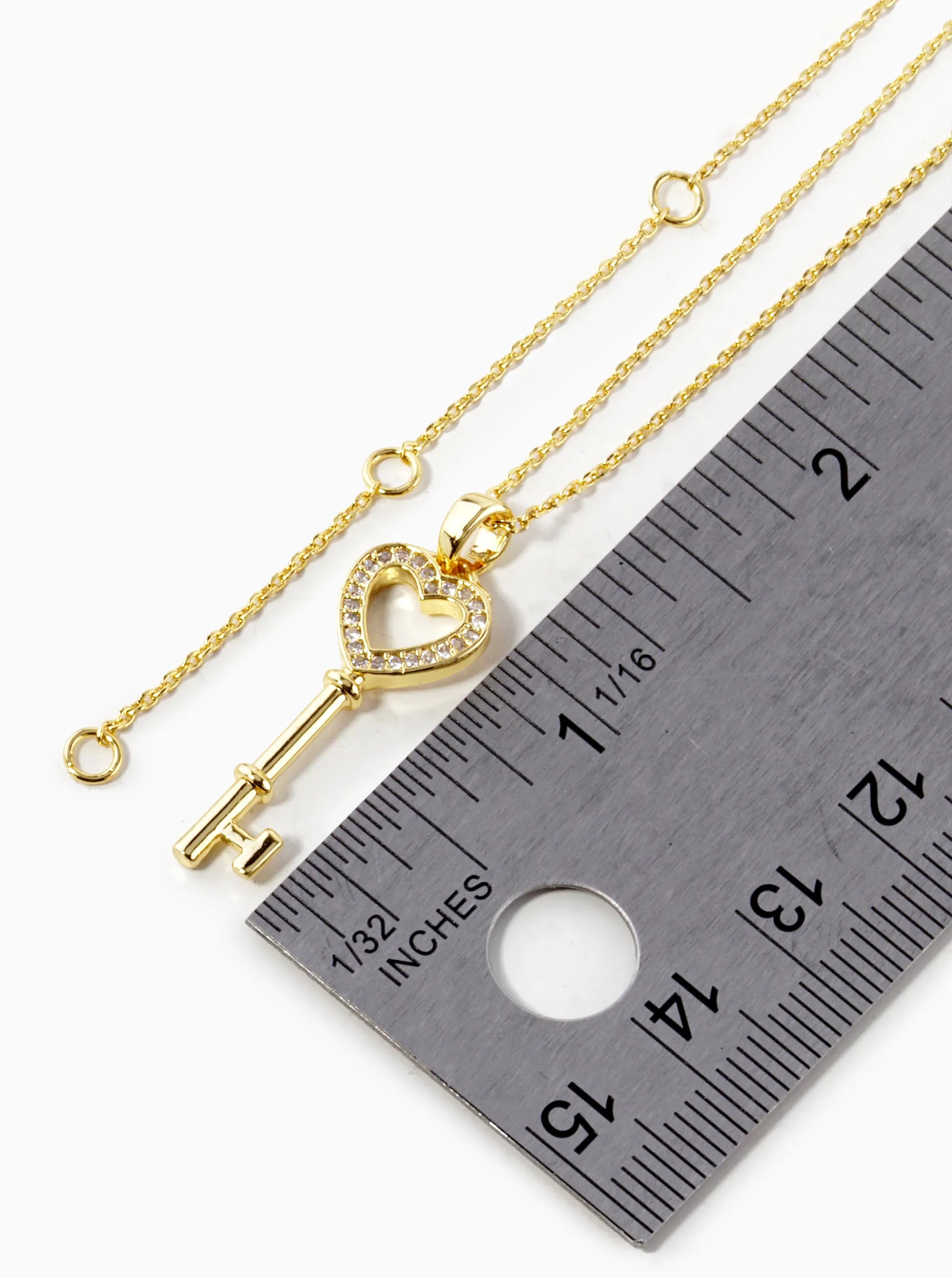 18K Gold Dipped CZ Pave 1 Inch Heart Key Pendant Necklace