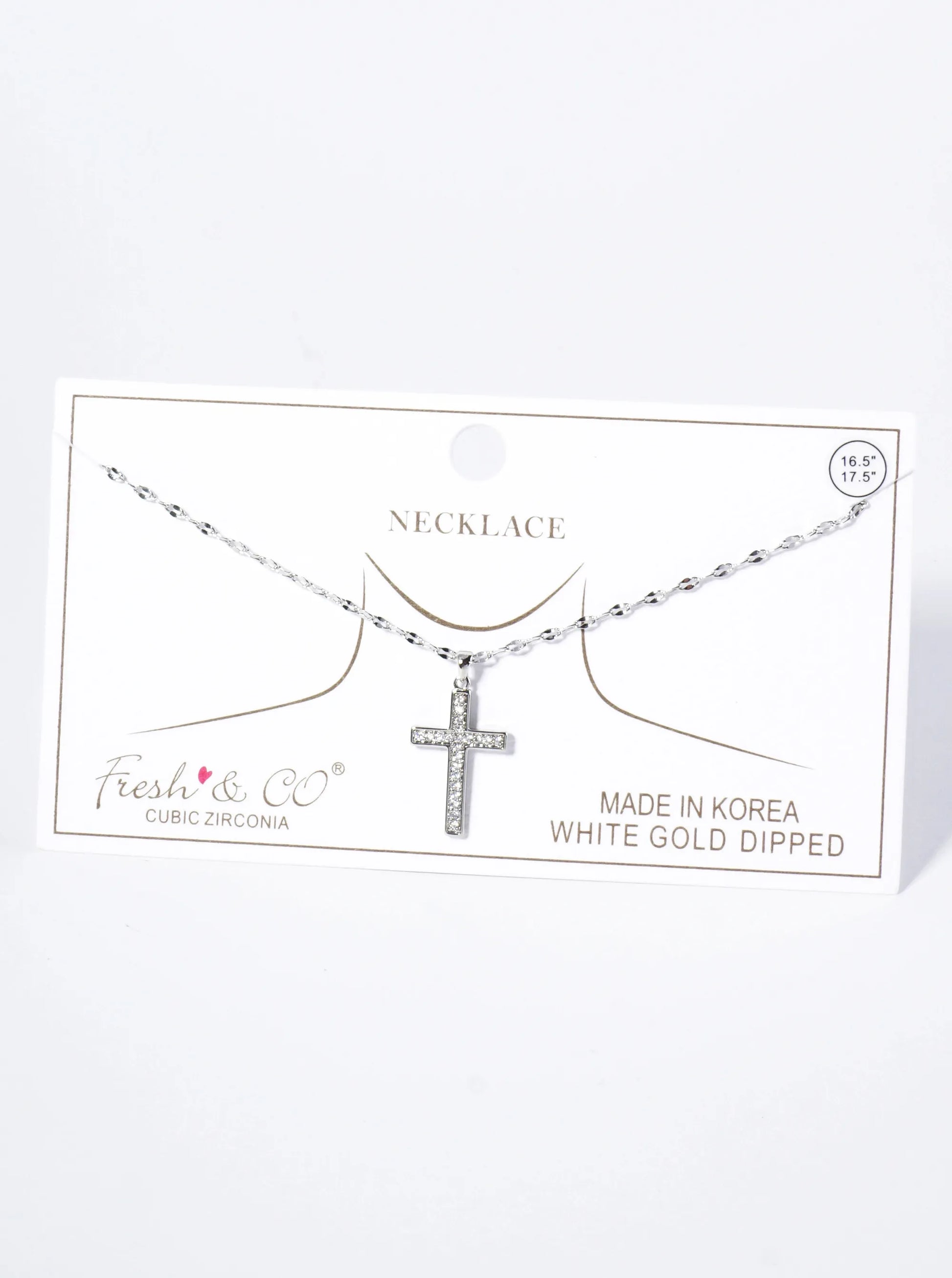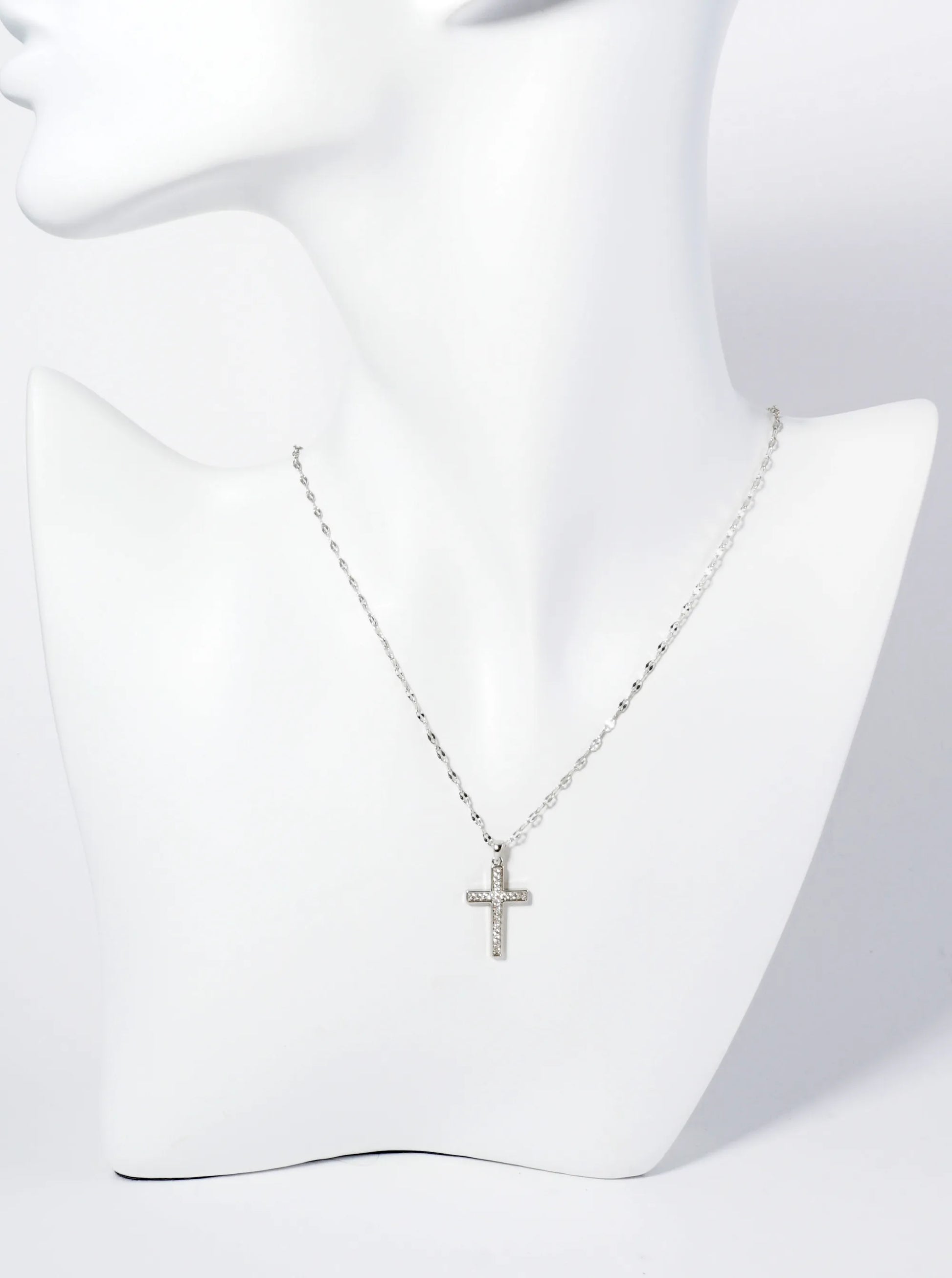 The Necklace Is A Sophisticated And Timeless Piece That Exudes Elegance And Grace. The Focal Point Is A Cross Pendant, Meticulously Encrusted With Pave-set Cubic Zirconia (CZ) Stones. These CZ Stones Are Carefully Arranged To Cover The Entire Surface Of The Cross, Creating A Dazzling Effect That Catches The Light Beautifully.