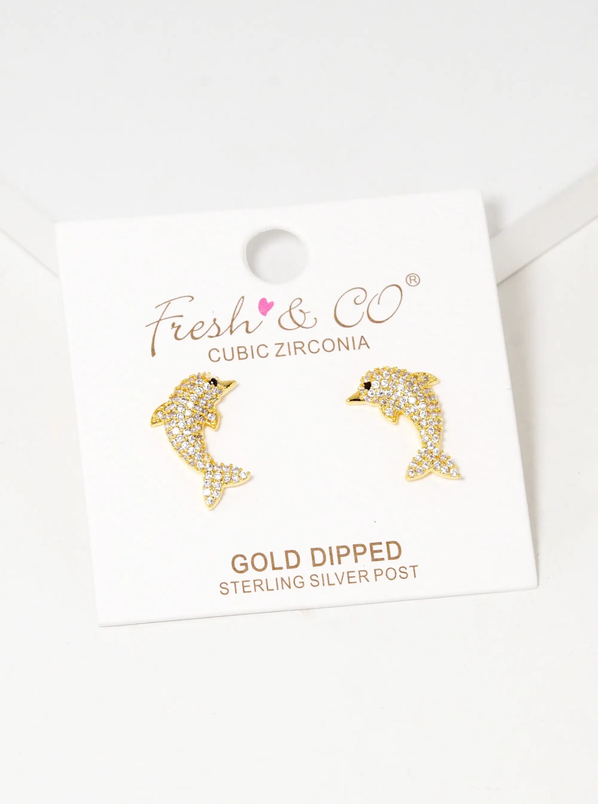18k Gold Dipped CZ Pave Dolphin Stud Earrings