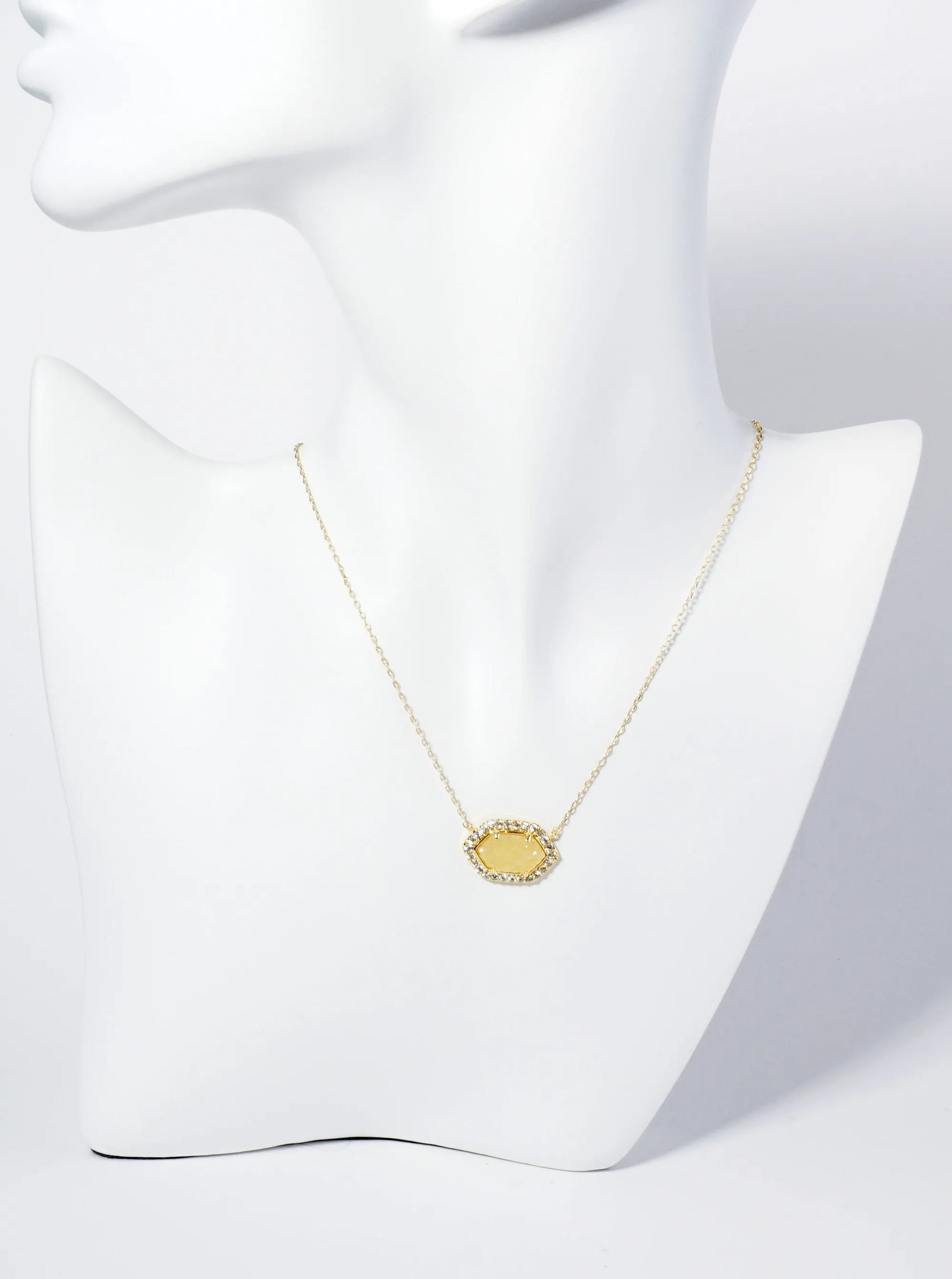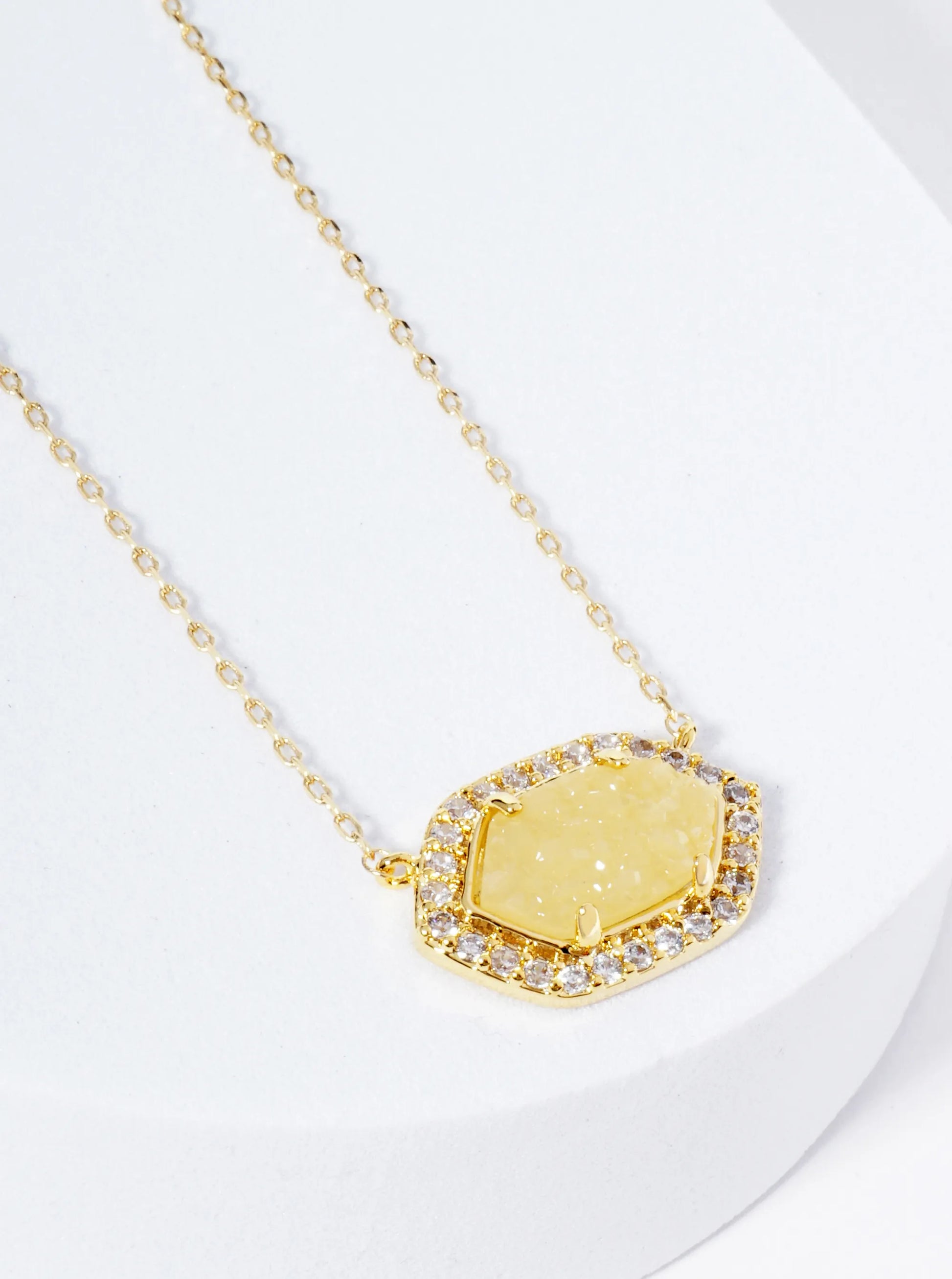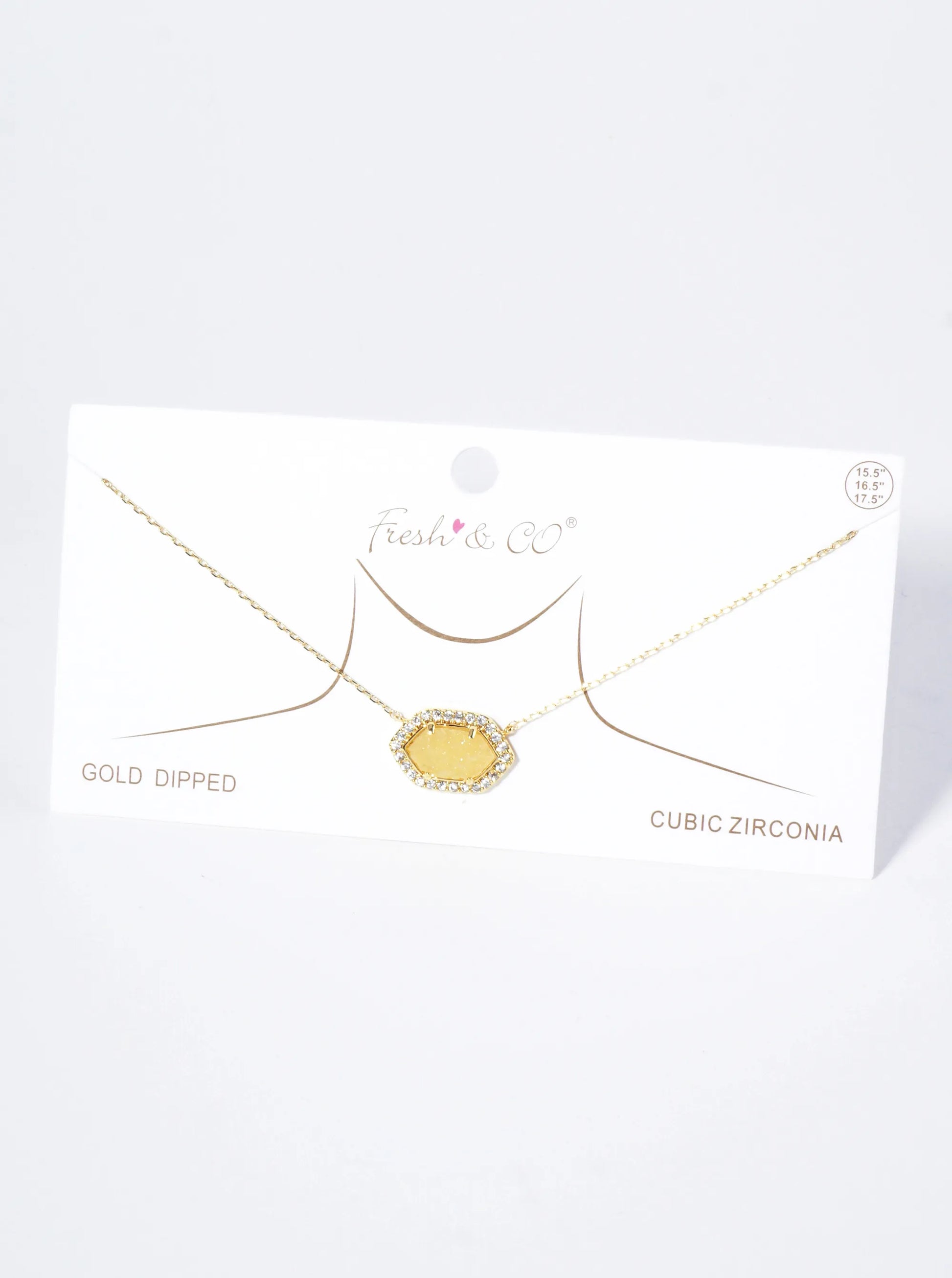 18K Gold Dipped CZ Pave Elongated Druzy Hexagon Pendant Necklace