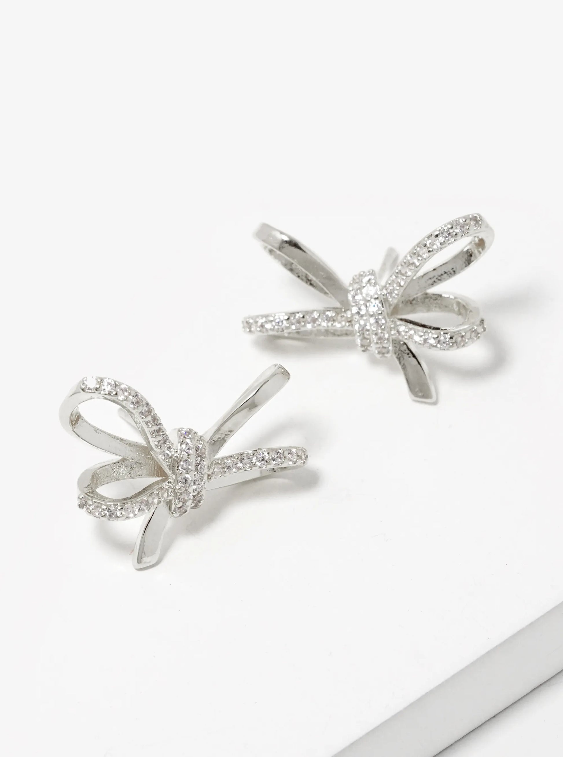 18K Gold Dipped CZ Pave Ribbon Bow Stud Earrings