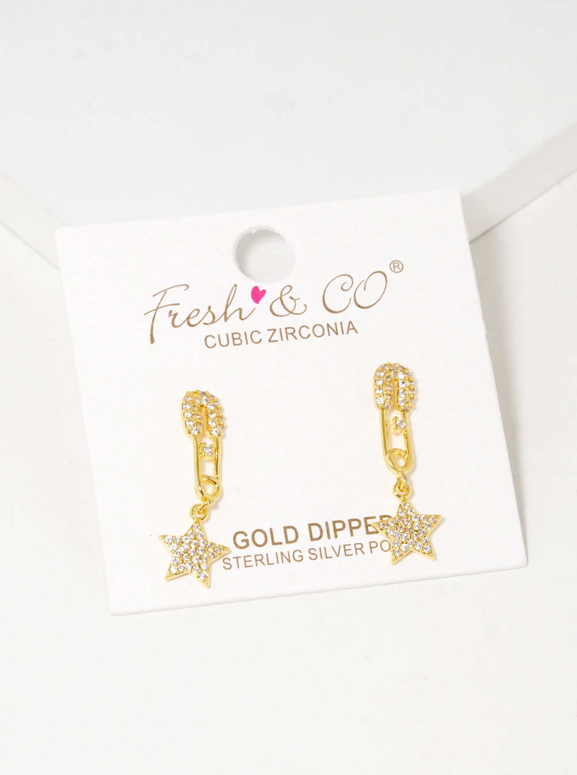 18K Gold Dipped CZ Pave Star Drop Safety Pin Stud Earrings