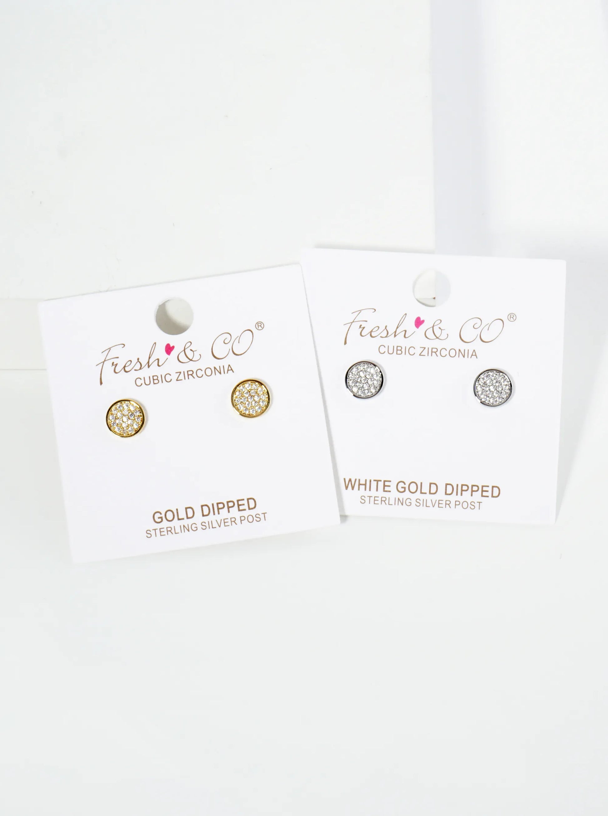 18K Gold Dipped Pave Set CZ 7mm Round Stud Earrings