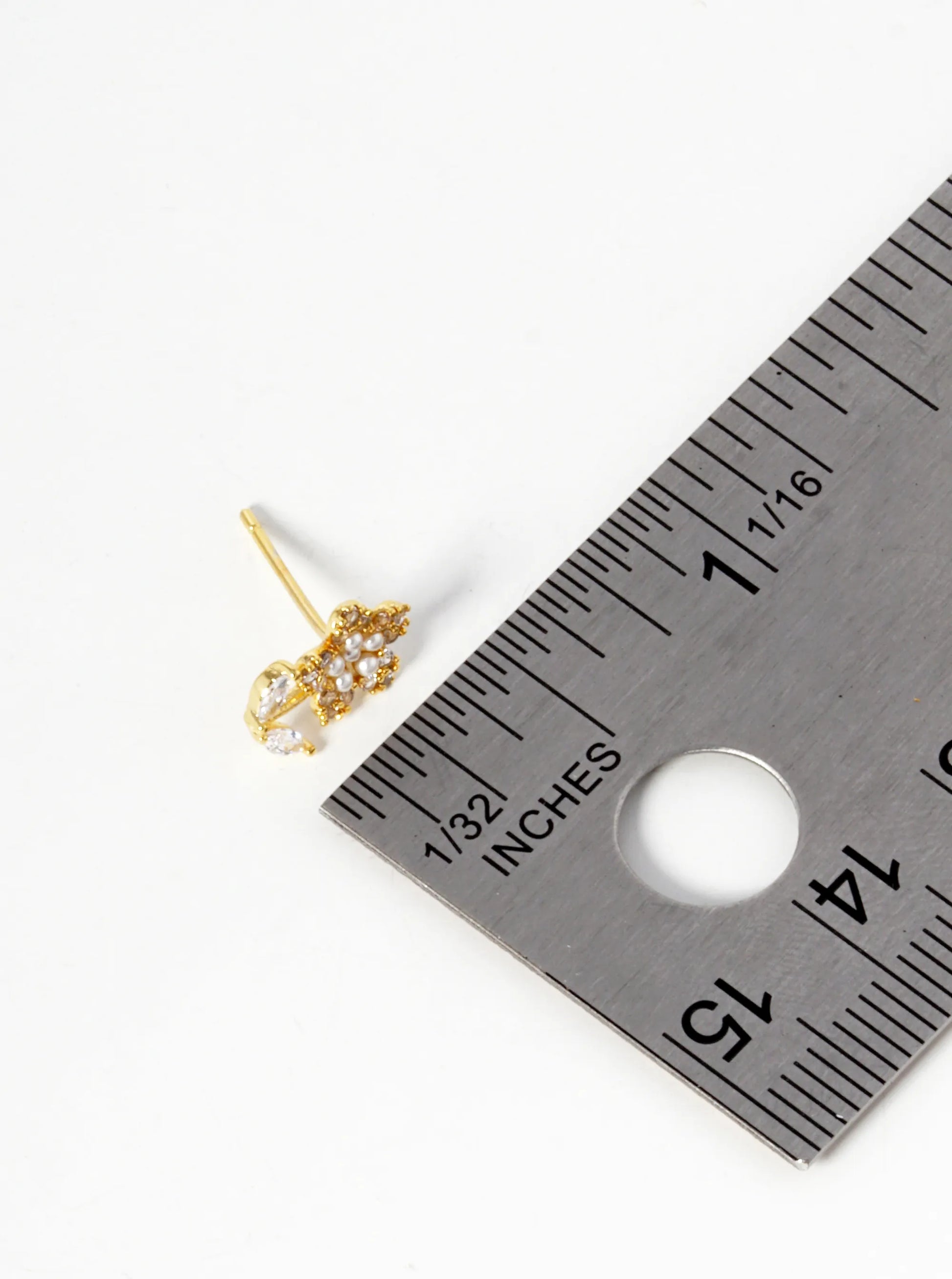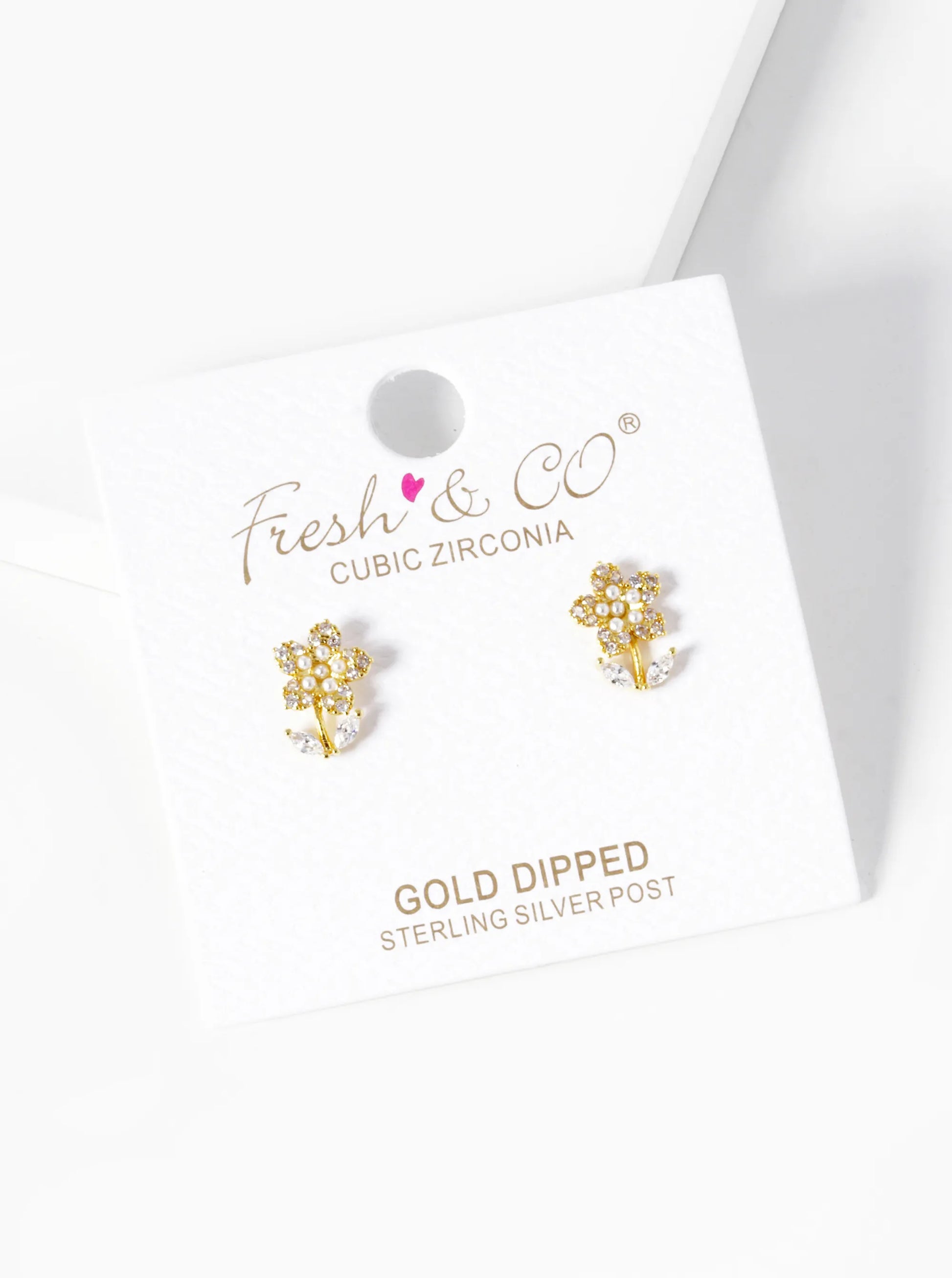 18k Gold Dipped Pearl And CZ Pave Flower Stud Earrings