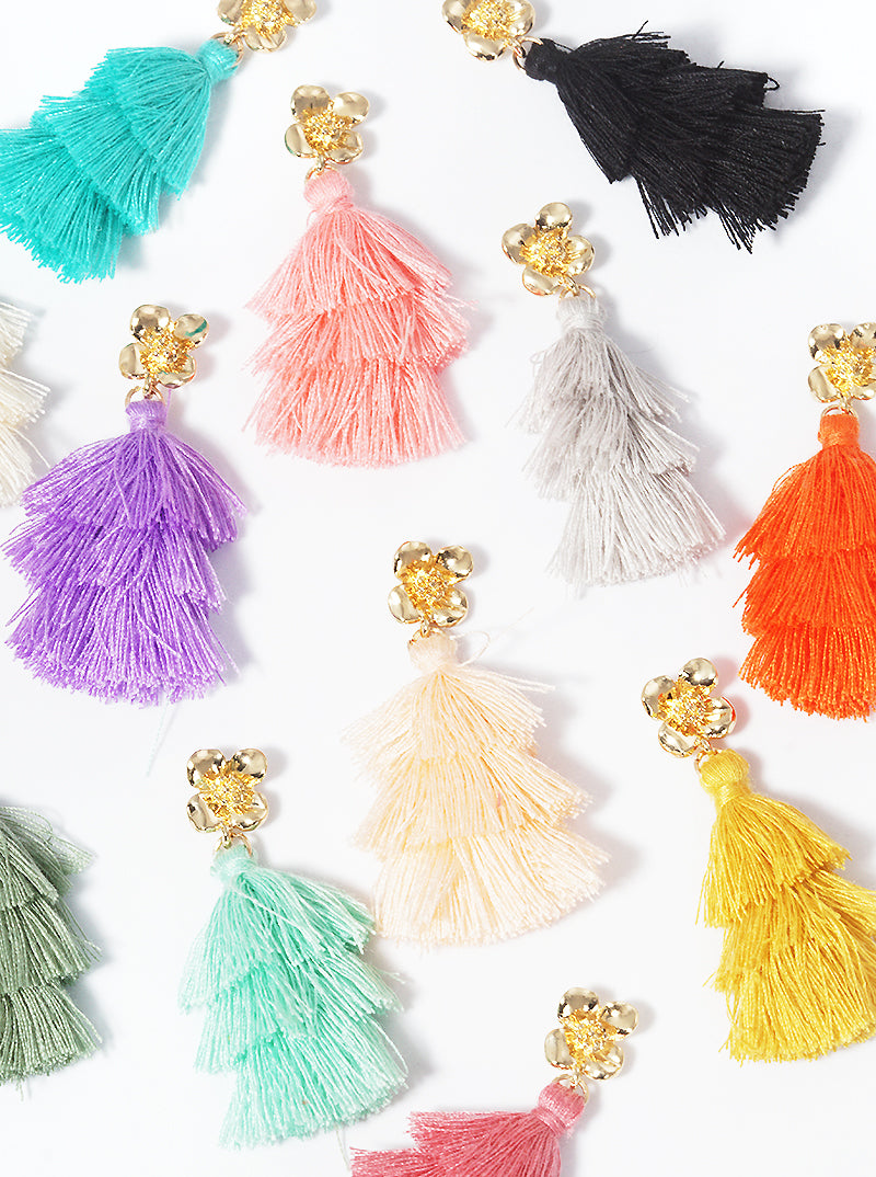 3-tier Thread Layered Fringe Tassel Drop Flower Post Dangle Earrings