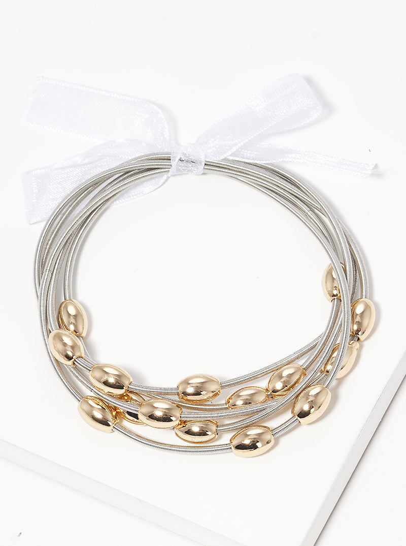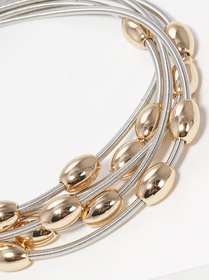 4PC-Set Curved Brass Bar Accents Tiny Metallic-Beaded Stackable Stretch Bracelet