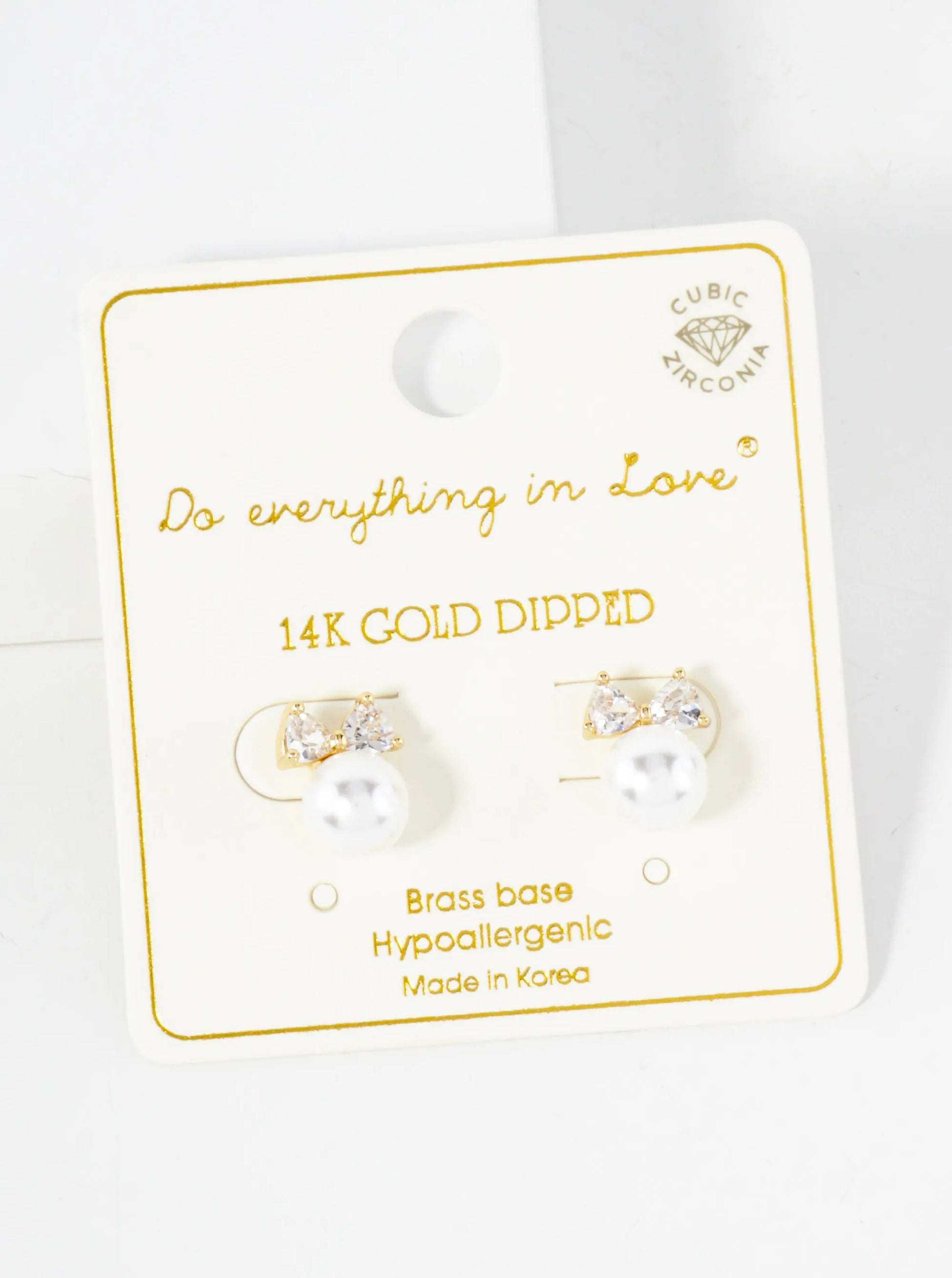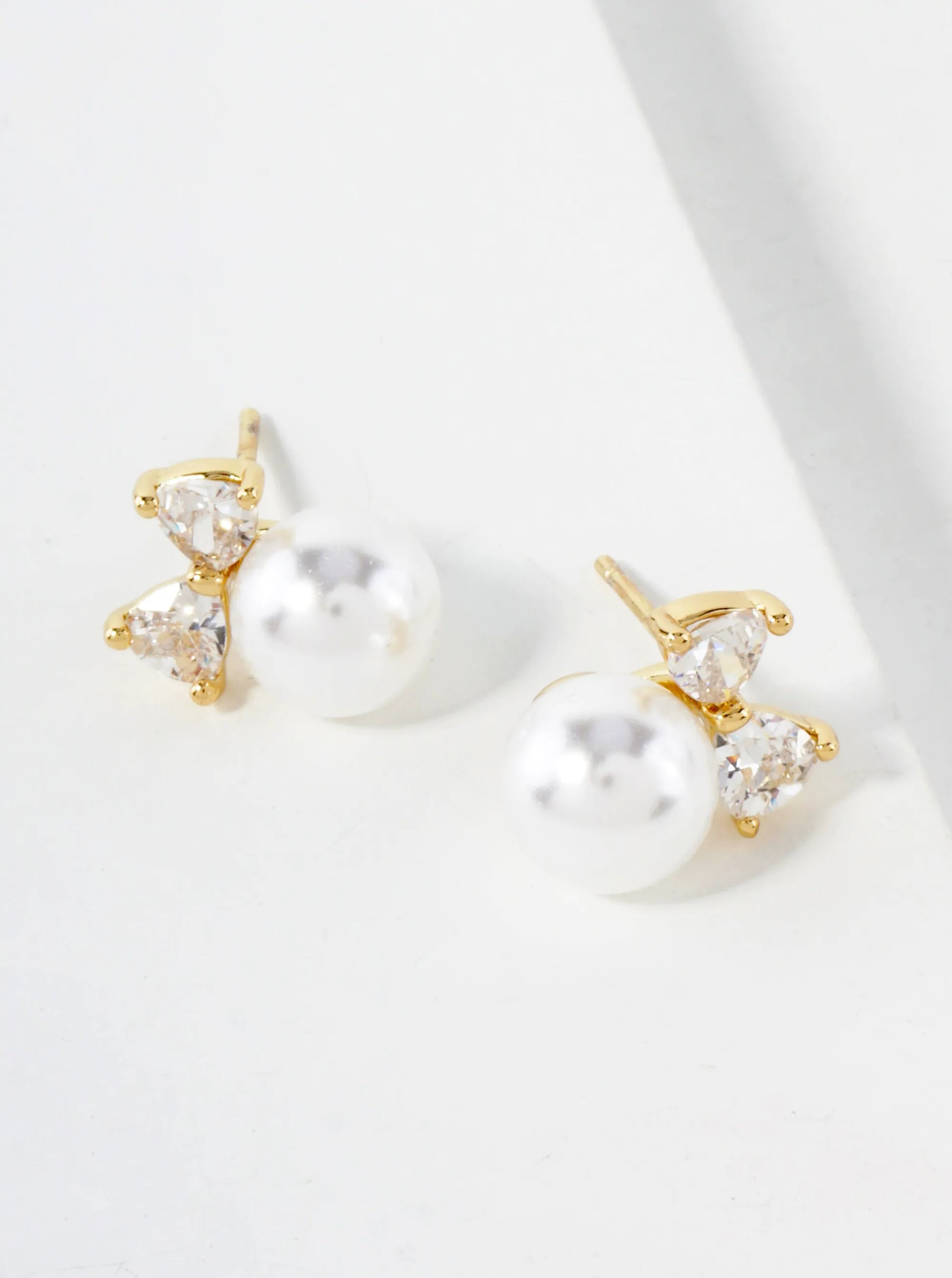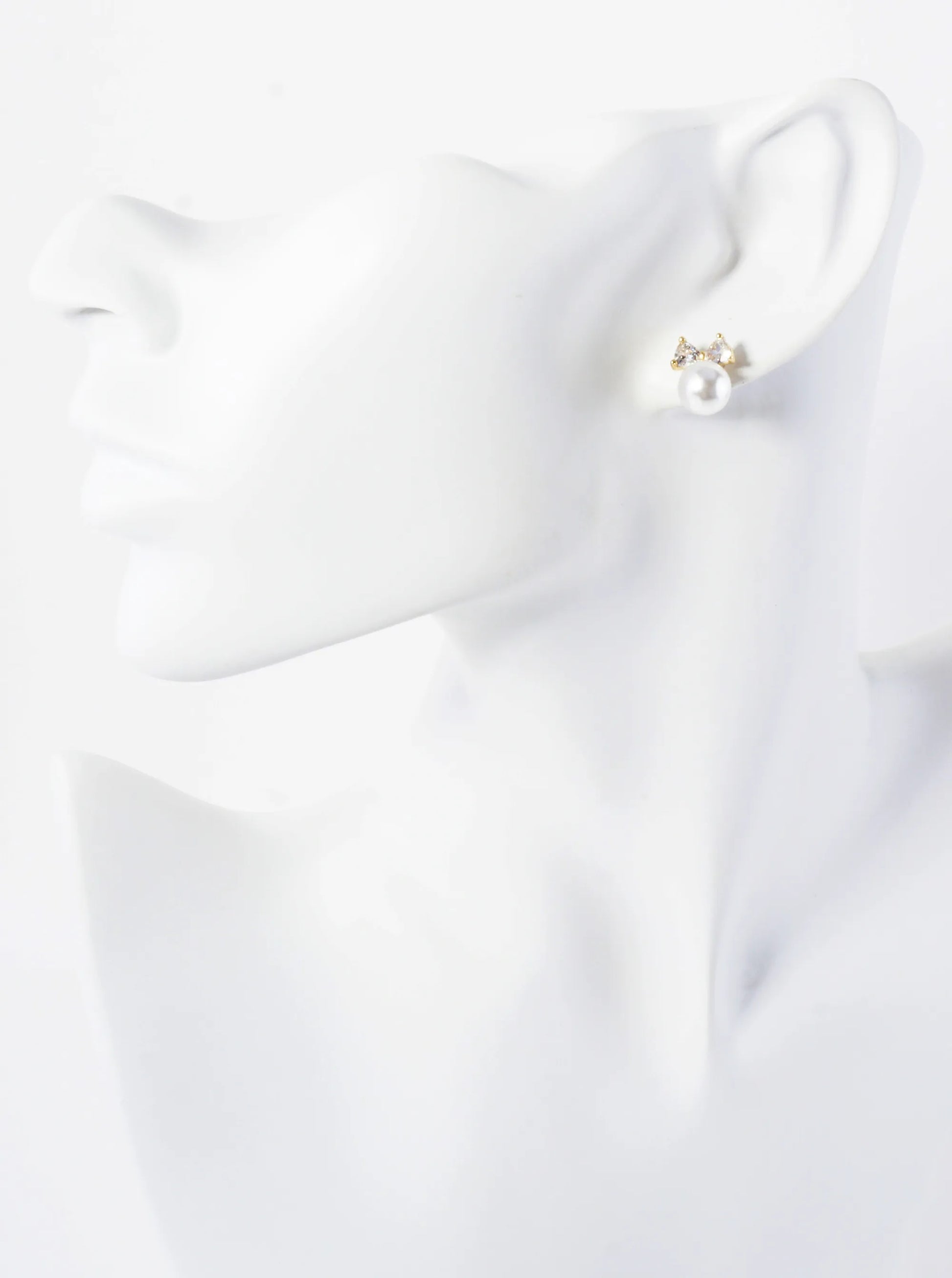 Delicate And Timeless With A Hint Of Sparkle, These Charming Stud Earrings Feature A Graceful Cubic-zirconia Bow Paired With A Classic 8mm Pearl Drop. Crafted From 14K Gold-dipped Brass, They Bring Together Playful Femininity And Vintage Elegance In A Lightweight, Wearable Design.