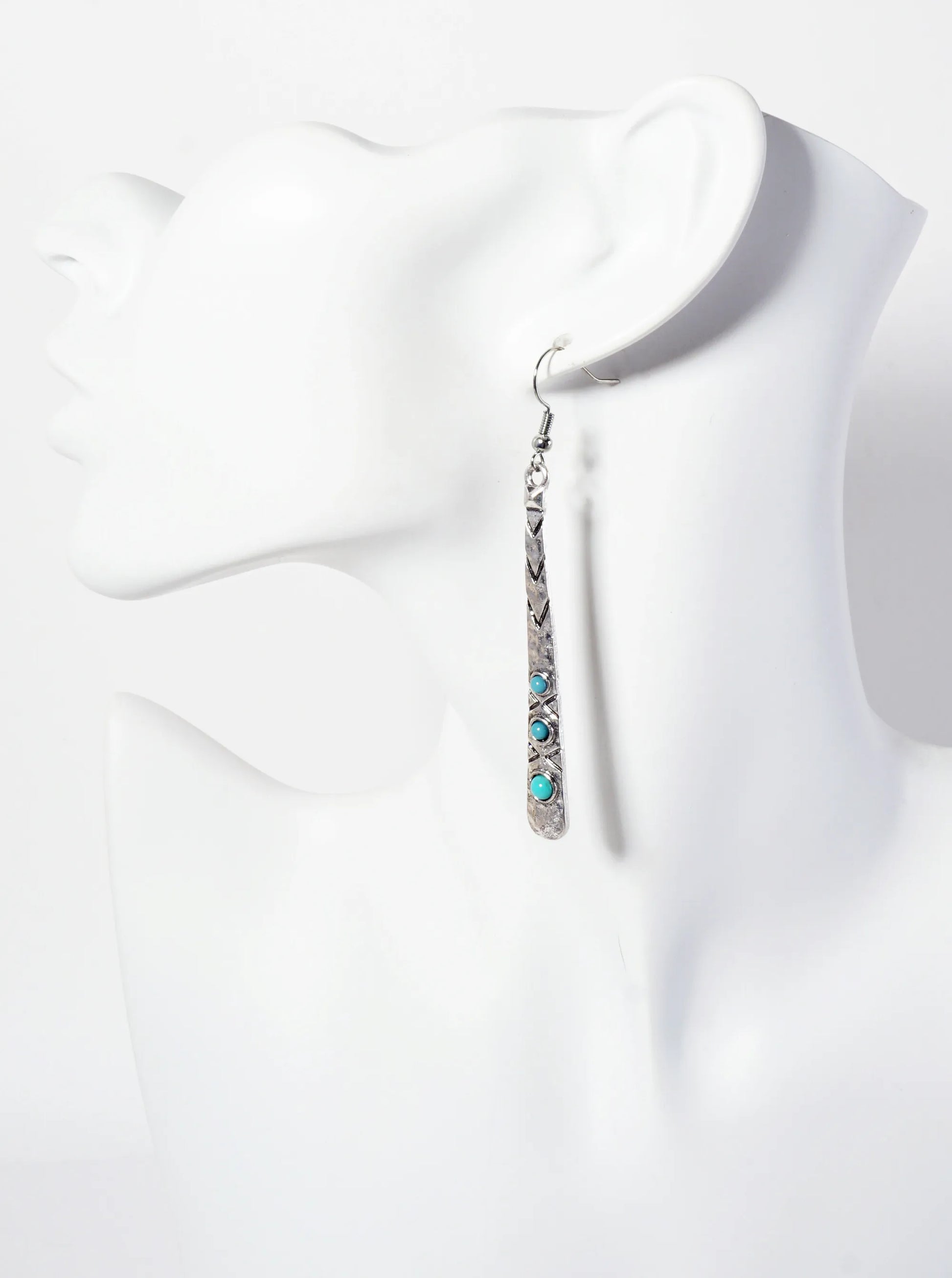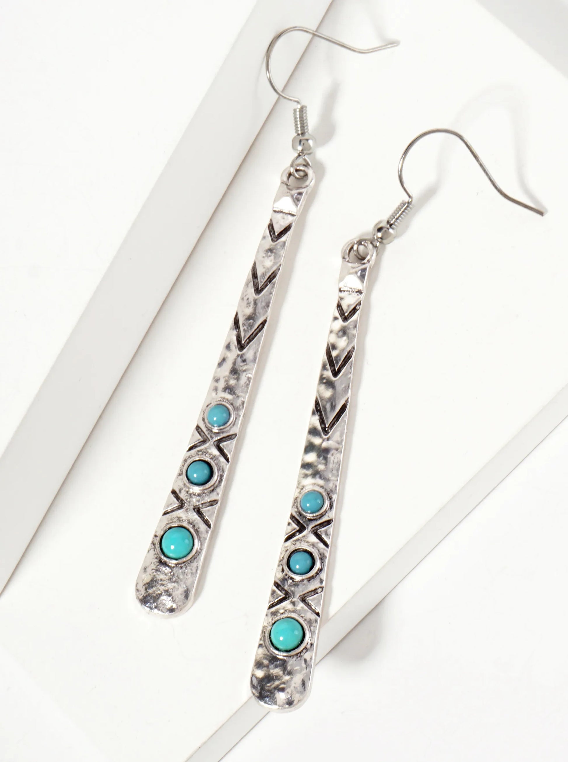 Arrow Pattern Engraved Hammered-Texture Bar Drop Earrings With Turquoise-Stones