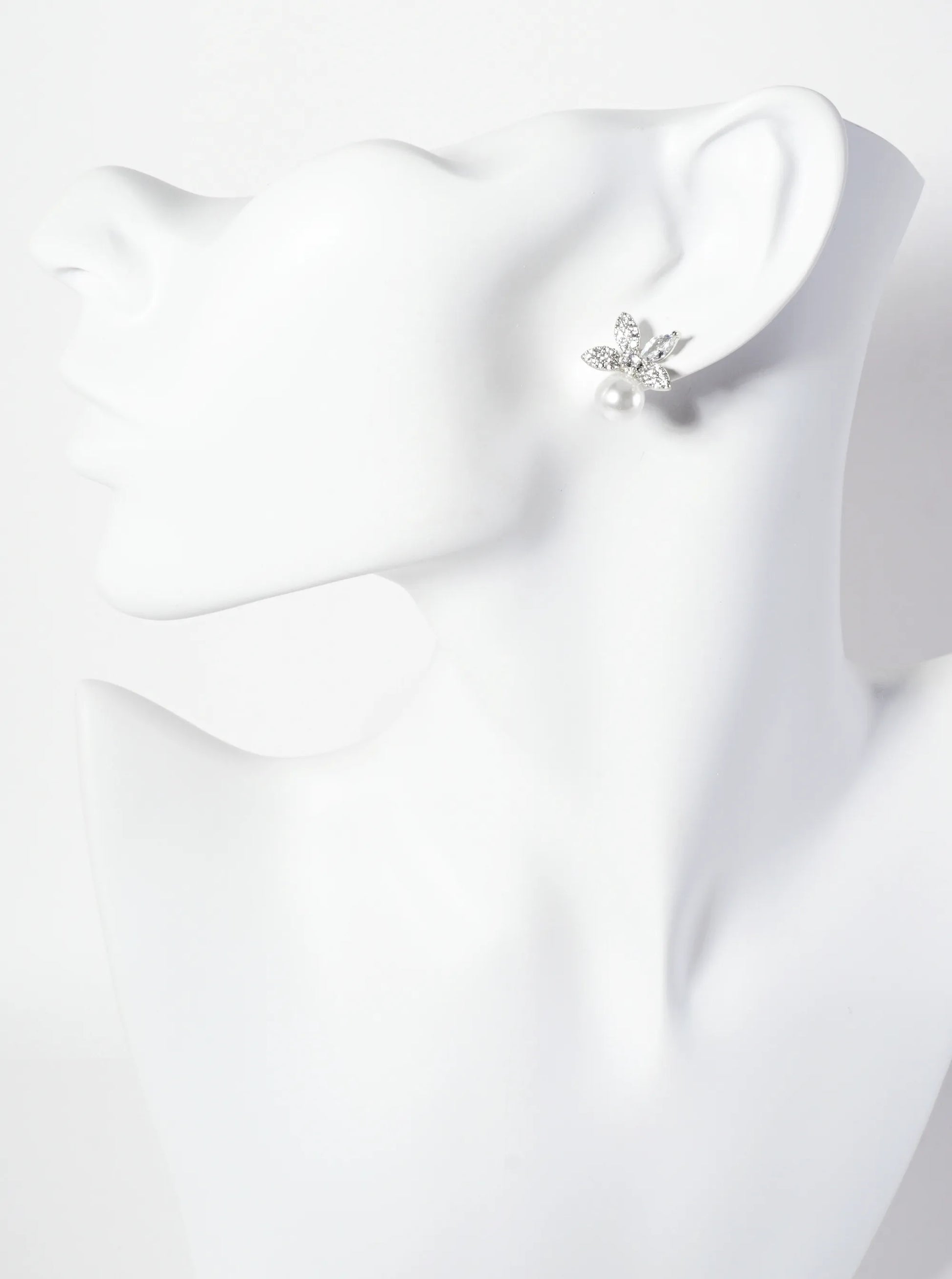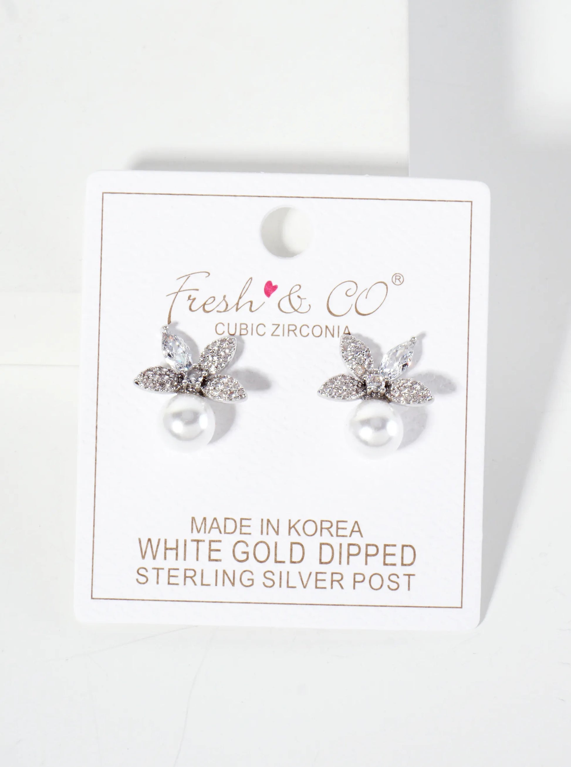 Botanical-Theme 8mm Pearl Drop Pave-Set Cubic-Zirconia 18K-Gold-Dipped Flower Stud Earrings
