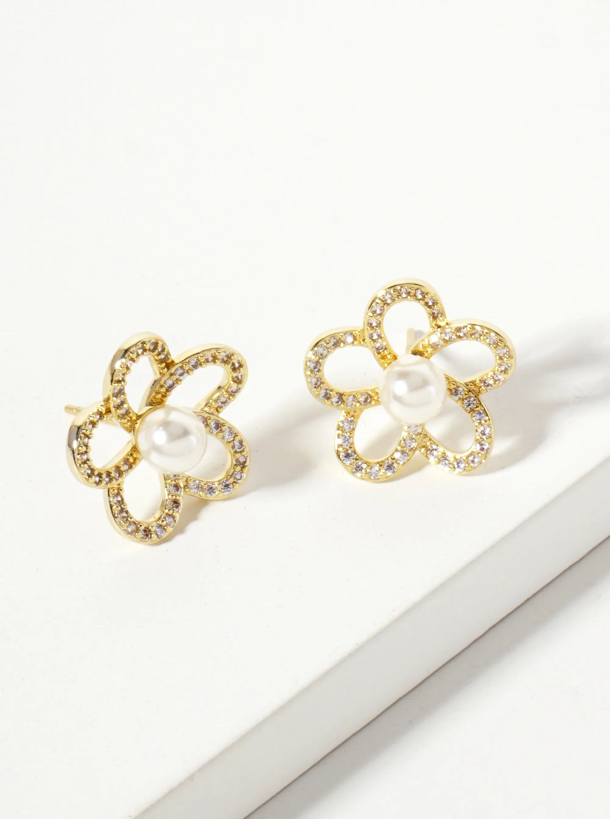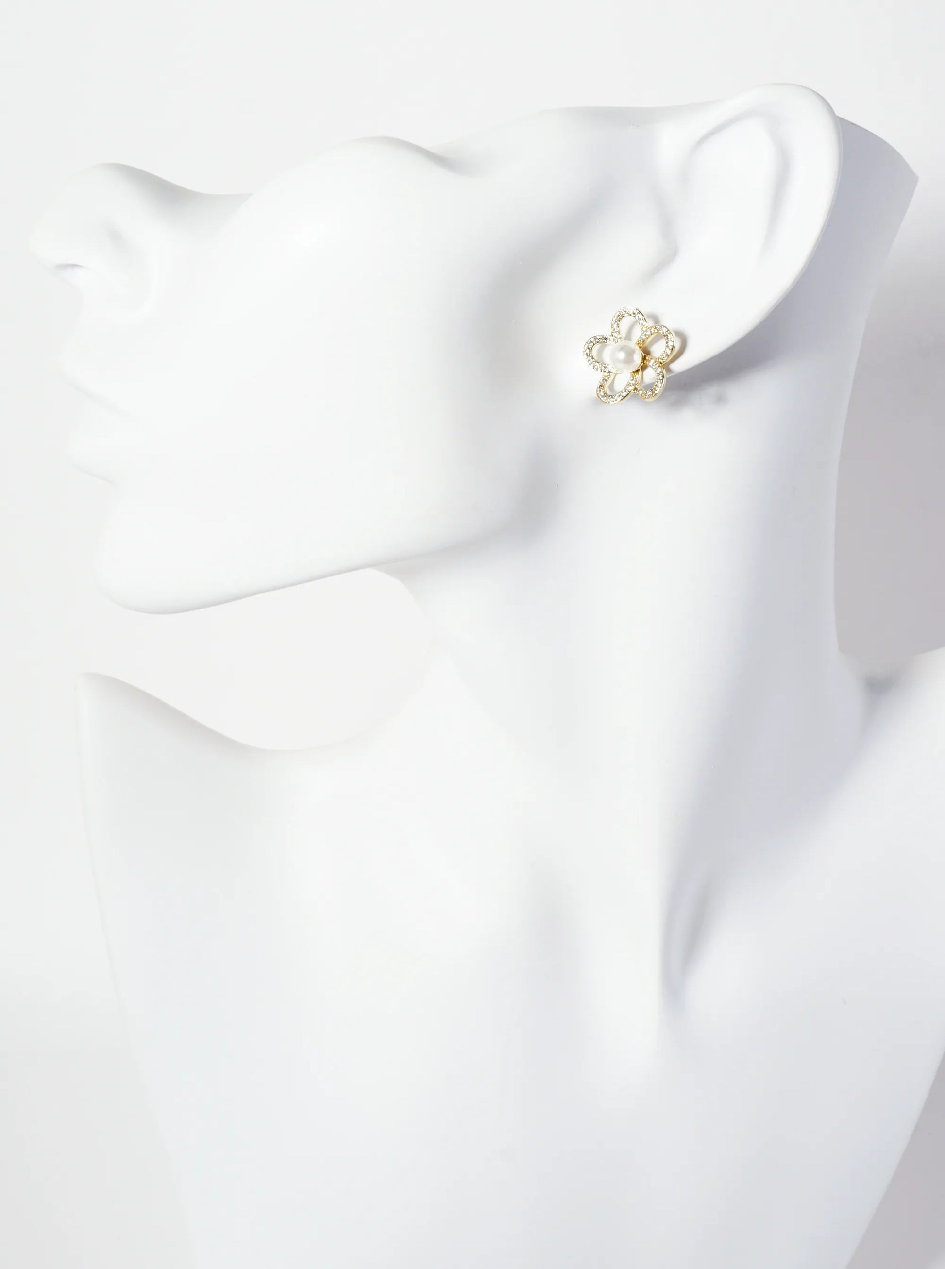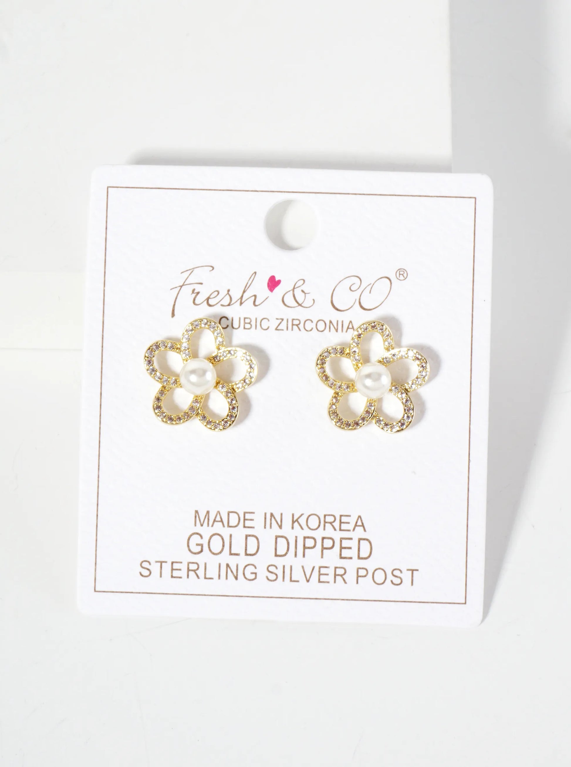 Botanical-Theme Pave-Set Cubic-Zirconia Pearl Flower 18K-Gold-Dipped Stud Earrings
