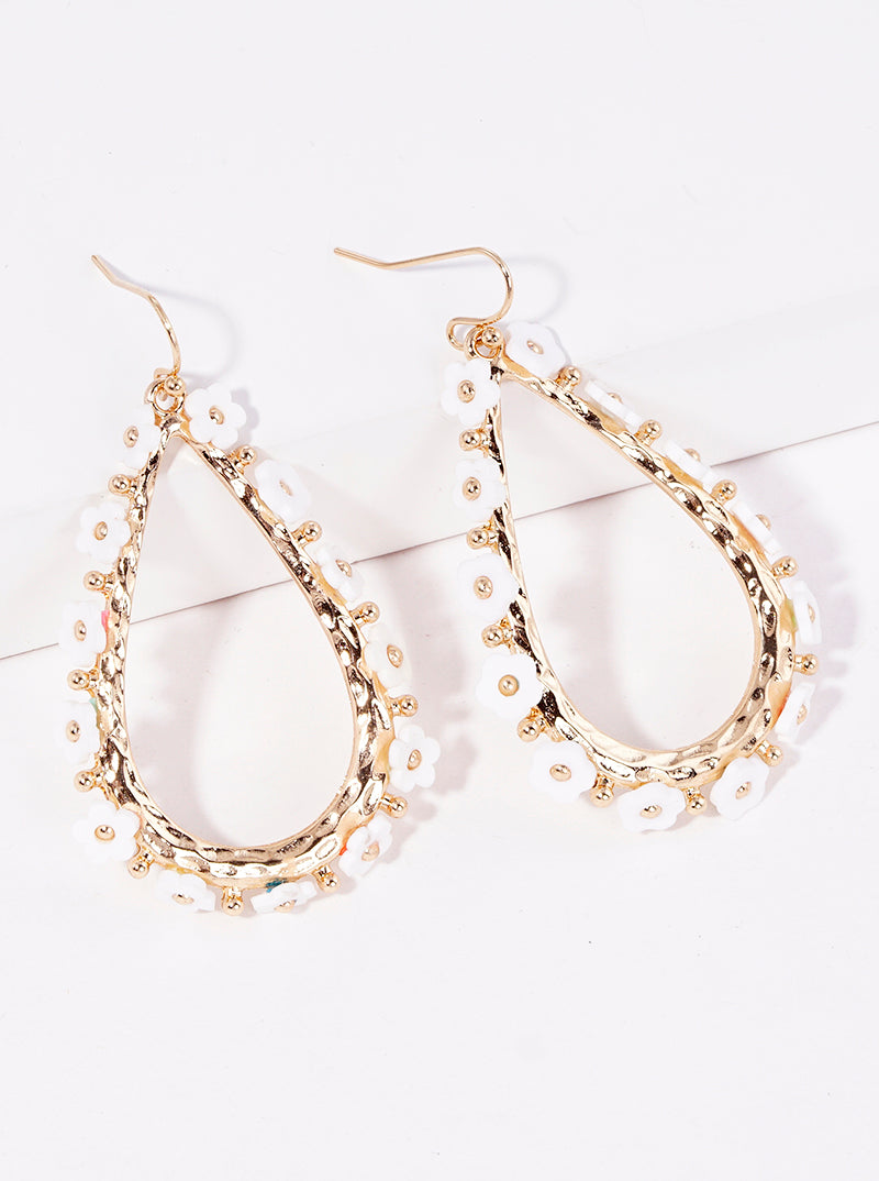 Flower Beaded Metal Hammer Textured Teardrop Dangle Earrings