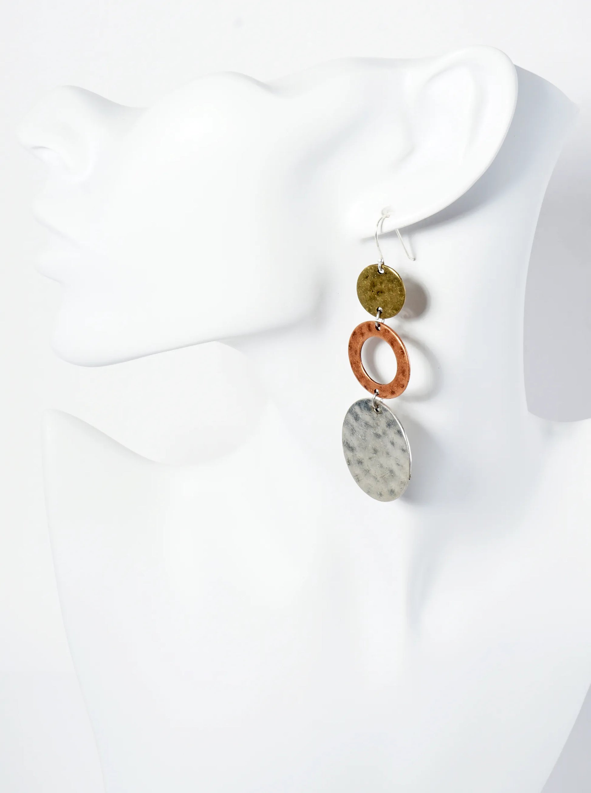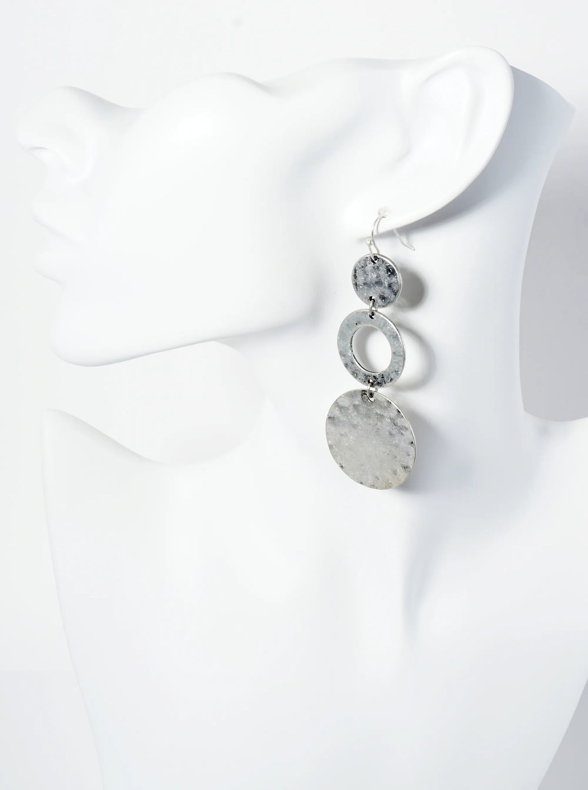 These Earrings Feature A Series Of Circles That Progressively Increase In Size As They Cascade Downward. Each Circle Is Adorned With A Hammered Texture, Giving The Metal A Handcrafted, Artisanal Look With Uneven Indentations That Add Depth And A Rustic Charm. The Circles Are Arranged In A Graduated Design, Creating A Sense Of Balance And Flow As They Dangle Elegantly. The Hammered Texture Catches Light Beautifully, Enhancing The Earrings’ Organic And Dynamic Appearance. These Earrings Are Perfect For Adding A Bold, Yet Sophisticated Statement To Any Outfit With Their Timeless And Artistic Style.
