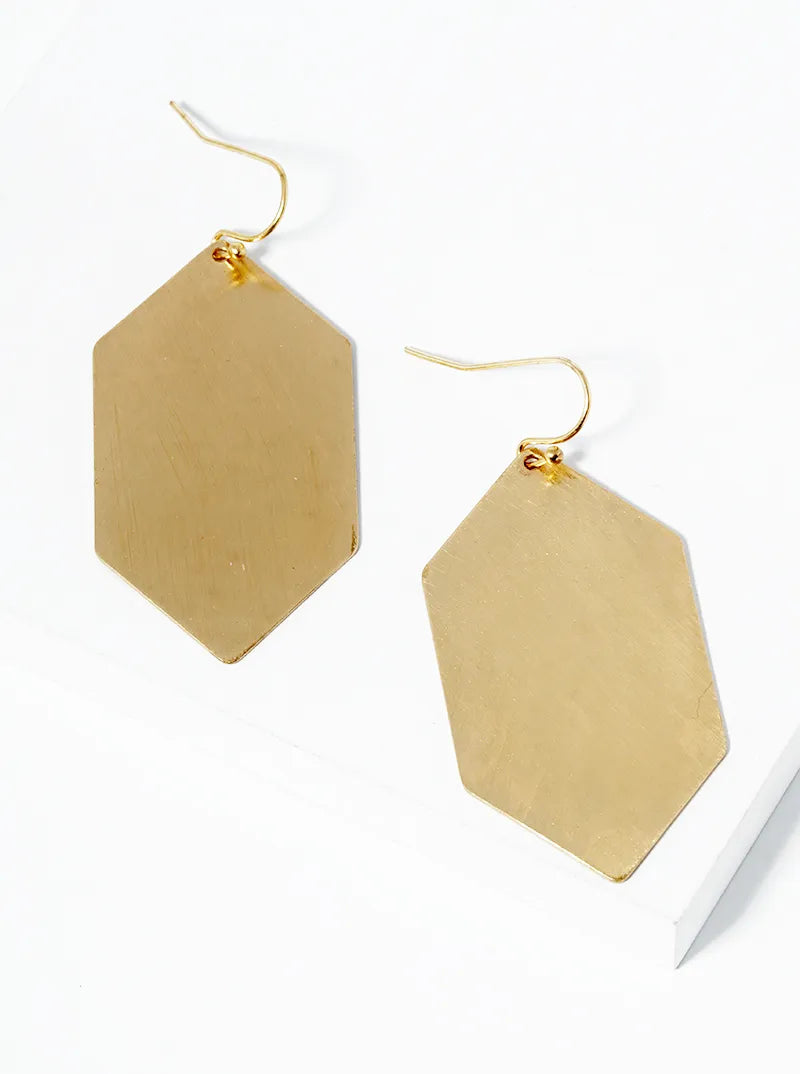 Long Hexagon Satin Brushed Brass Drop Earrings