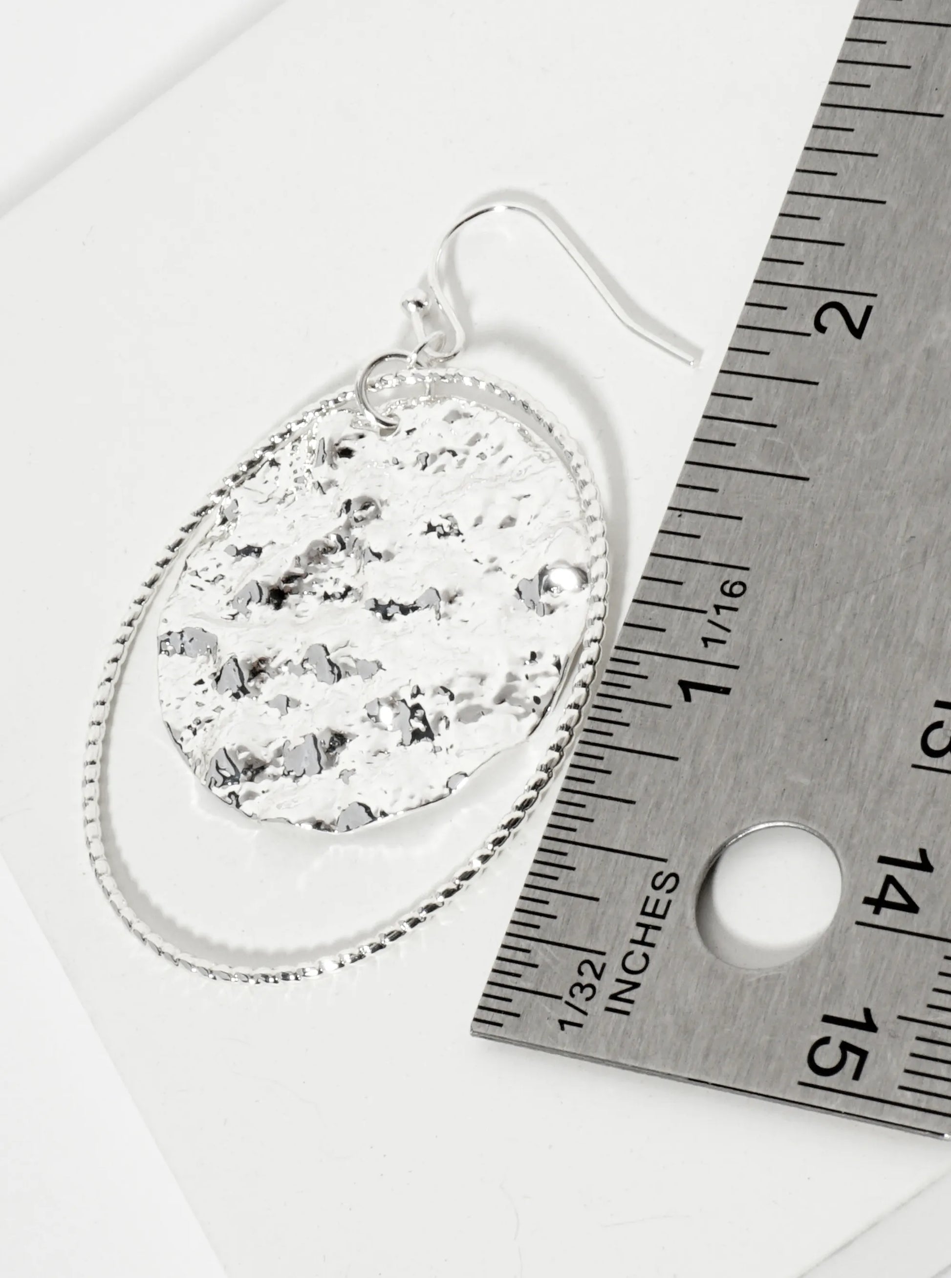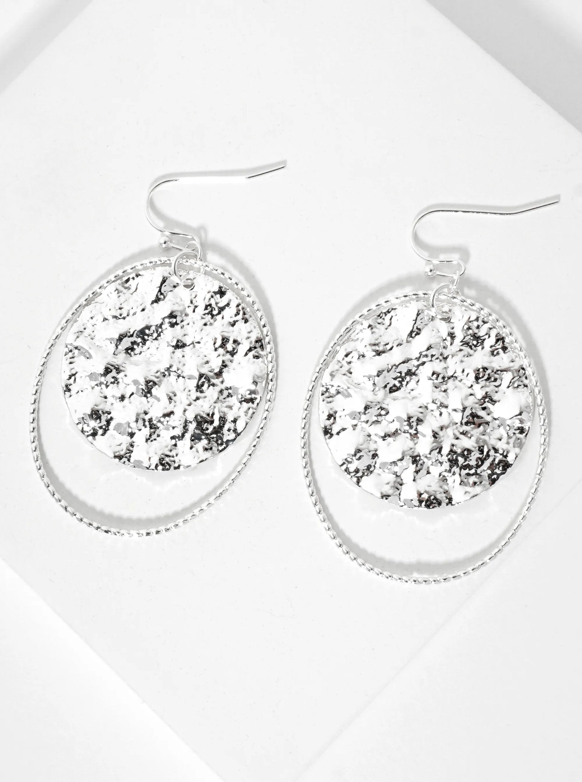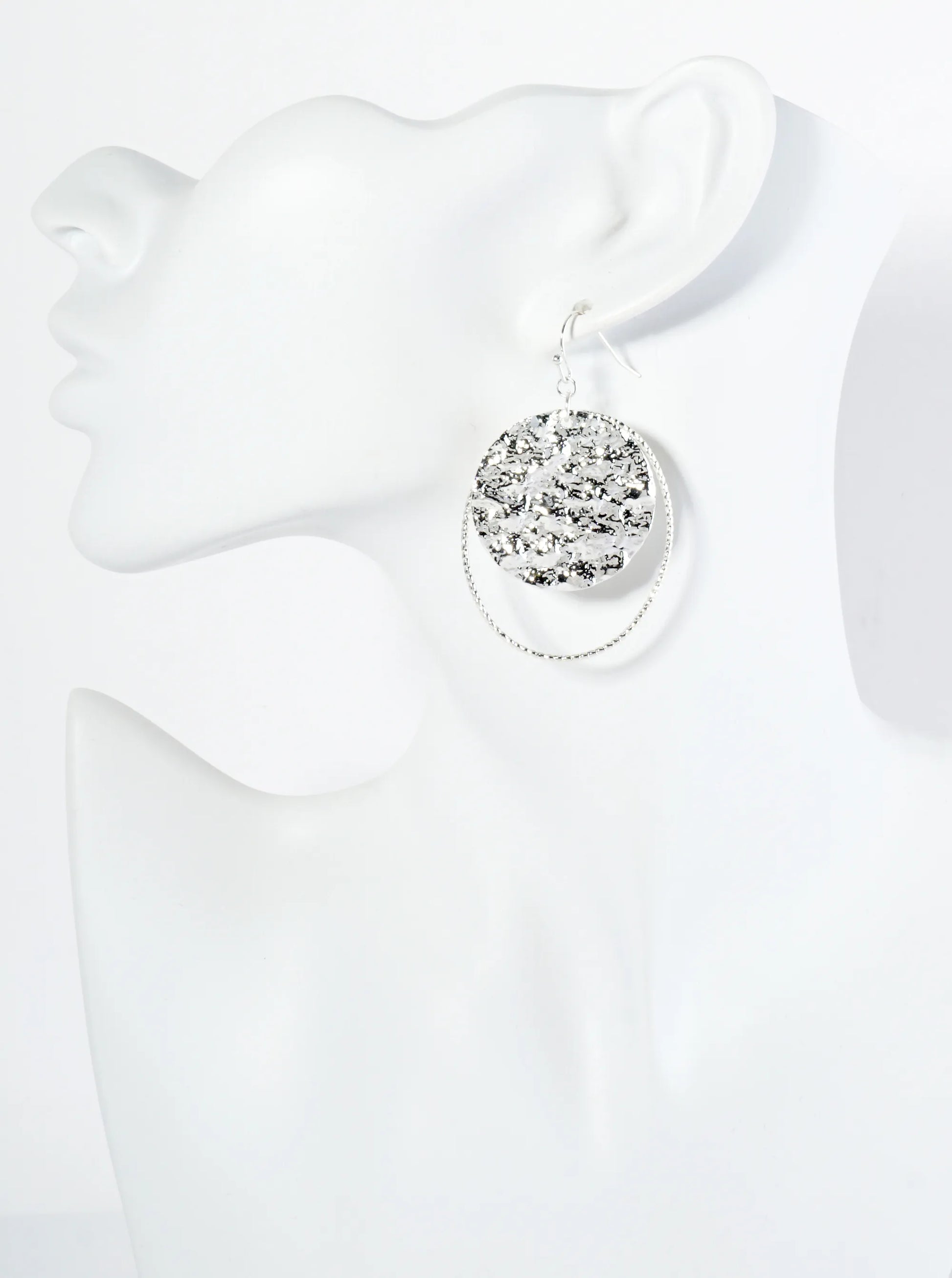 These Earrings Present A Unique And Modern Design That Captures Attention With Their Artistic Charm. Each Earring Features A Combination Of A Circular And An Oval Shape, Elegantly Suspended To Create A Dynamic Silhouette. Both Elements Are Crafted From A Lightweight Metal, Adorned With A Textured Finish That Enhances Visual Interest And Depth. This Texture Reflects Light Beautifully, Adding A Subtle Shimmer And Catching The Eye With Every Movement.