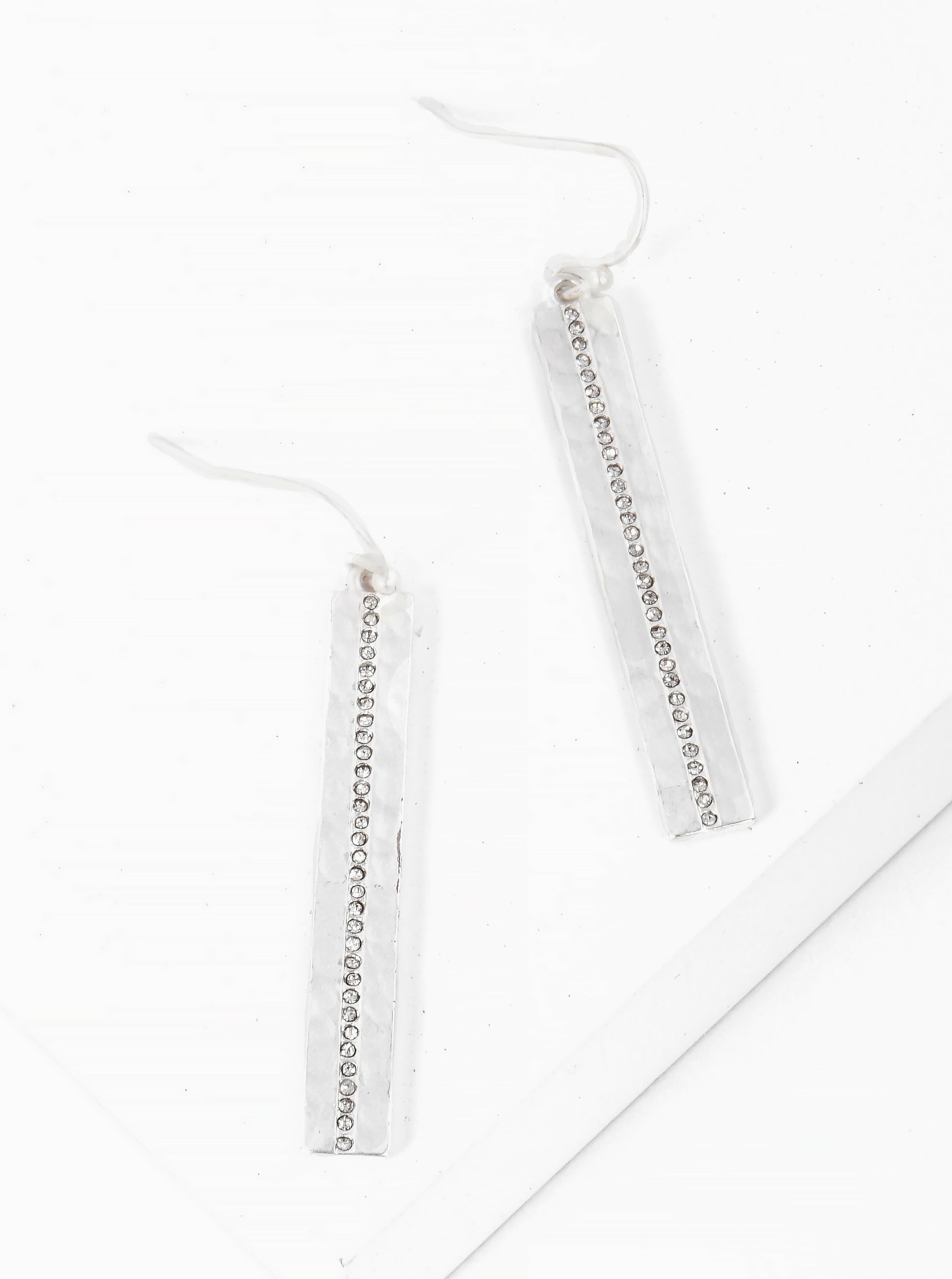 Micro Crystal Pave Hammered Metal Rectangle Bar Drop Earrings