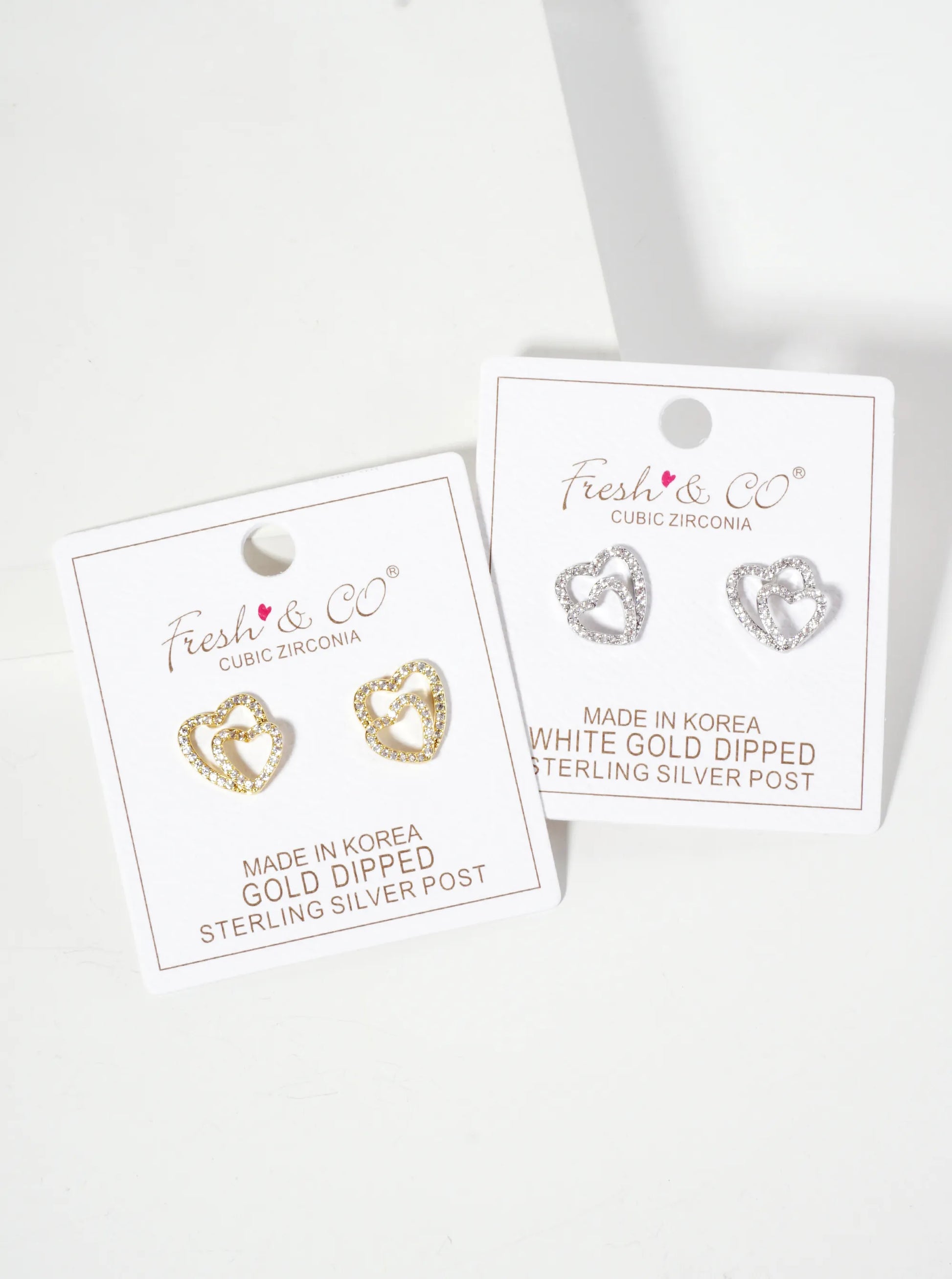 Overlapping Hearts Pave-Set Cubic-Zirconia 18K-Gold-Dipped Stud Earrings