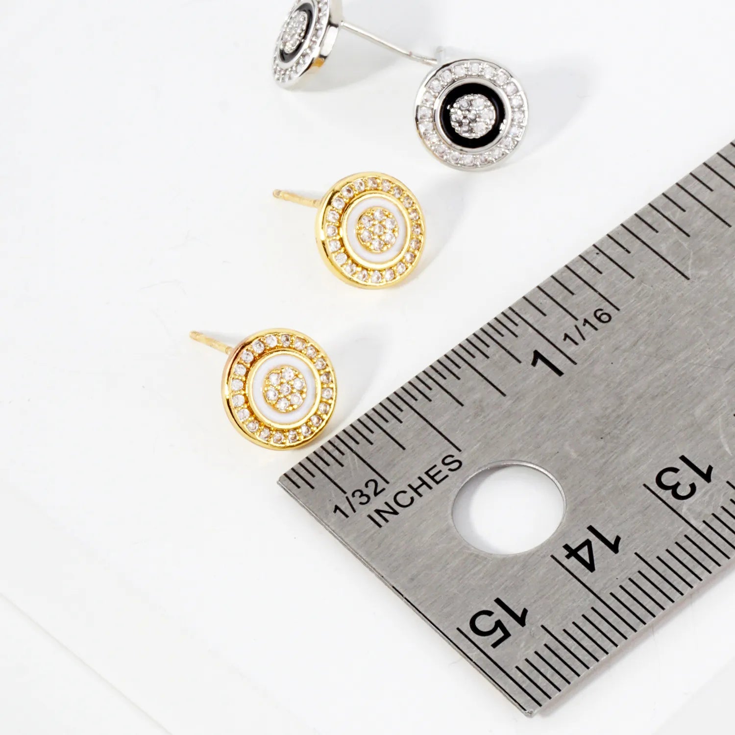 Pave-Set CZ Enamel 10mm 14K-Gold-Dipped Button Brass Stud Earrings