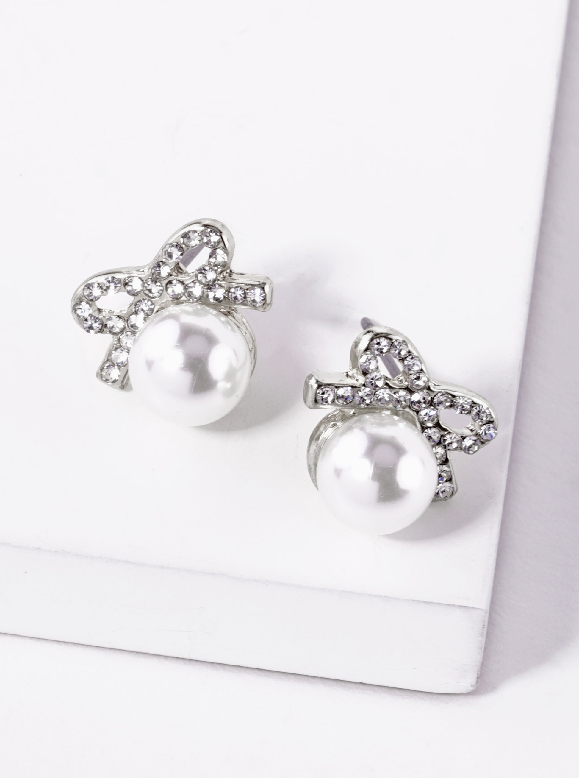 Pearl Bead Drop Crystal Pave Ribbon Bow Stud Earrings