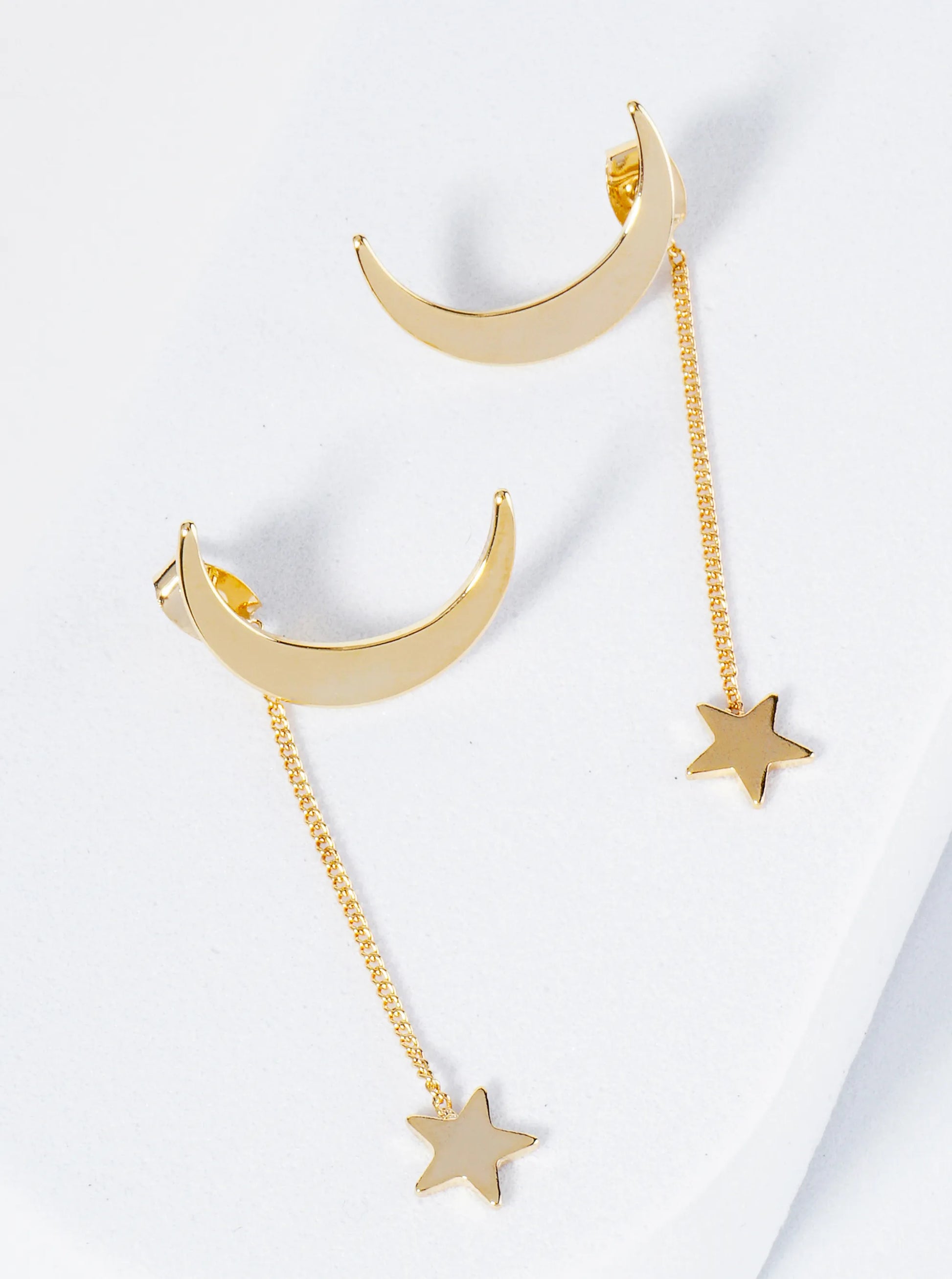 Polished 14K-Gold-Dipped Moon Stud Earrings With Star Chain Drop