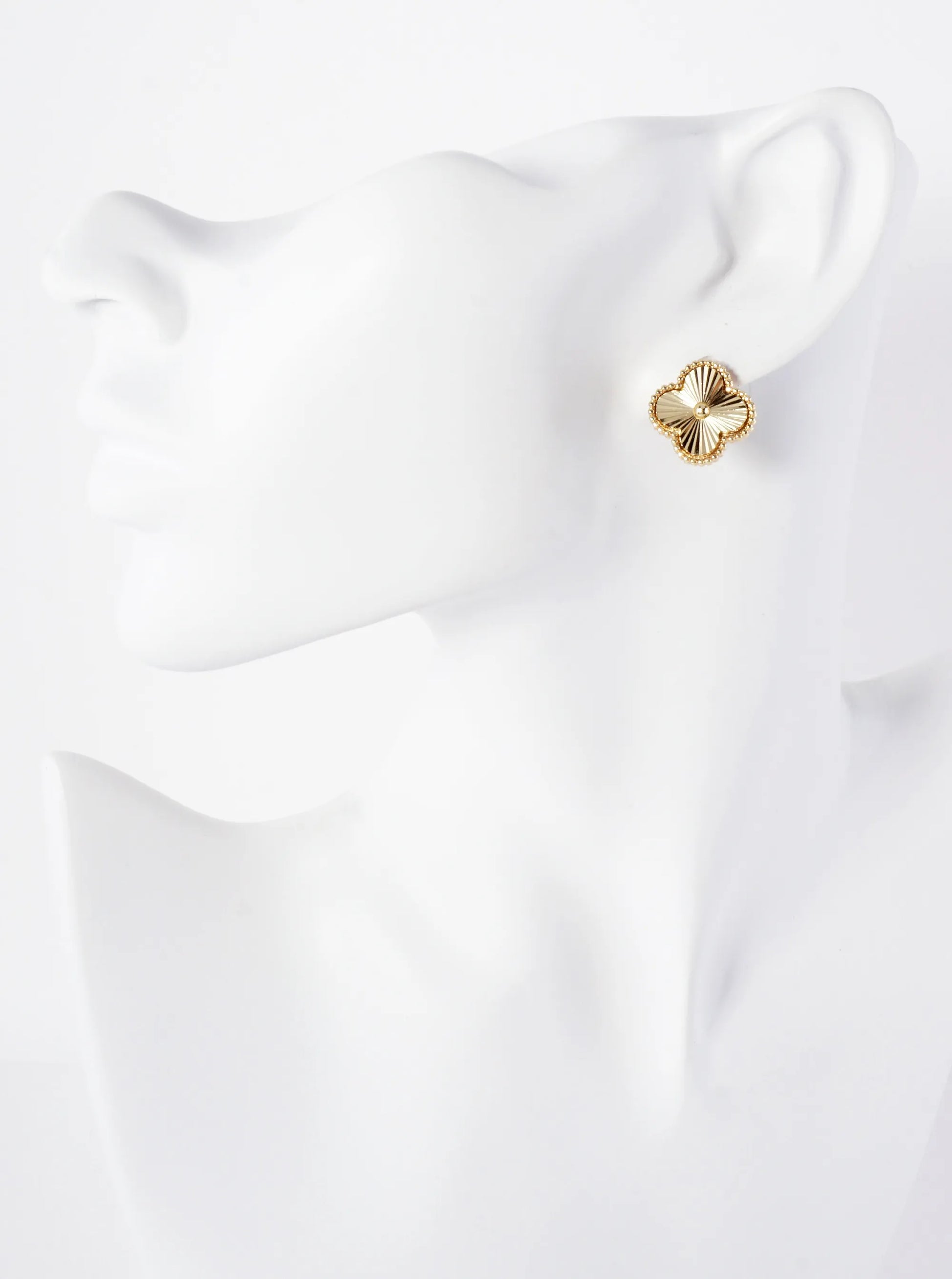 These Chic 15mm Stud Earrings Feature A Classic Quatrefoil Silhouette With A Subtly Textured Surface, Crafted From Polished Brass And Dipped In Luminous 14K Gold. The Combination Of The Intricate Texture And Radiant Finish Creates A Refined Yet Modern Look, Perfect For Adding A Sophisticated Touch Of Elegance To Both Casual And Dressy Outfits.