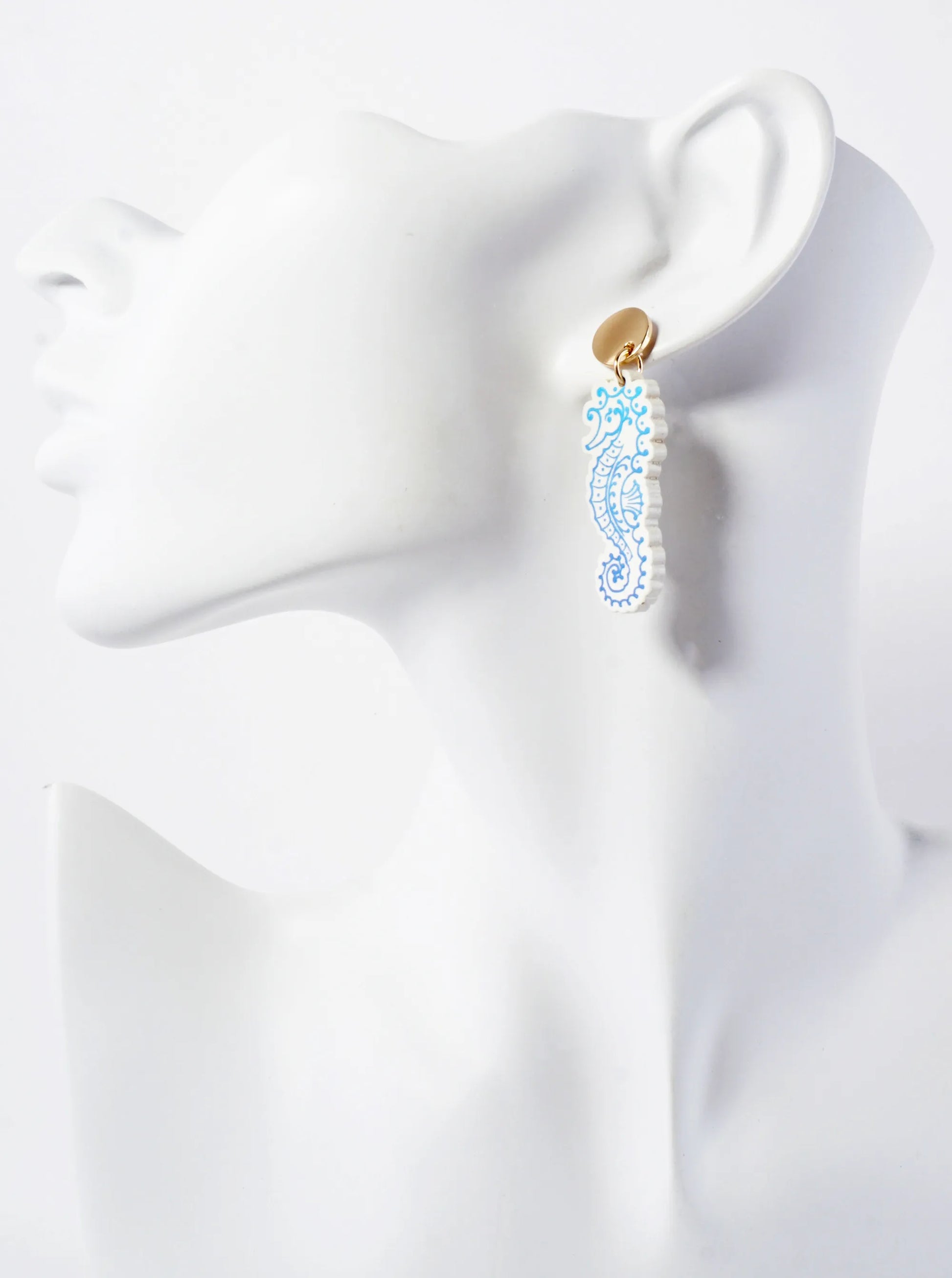 Sea-Life Laser-Cut Wood Seahorse Dangle Drop Earrings