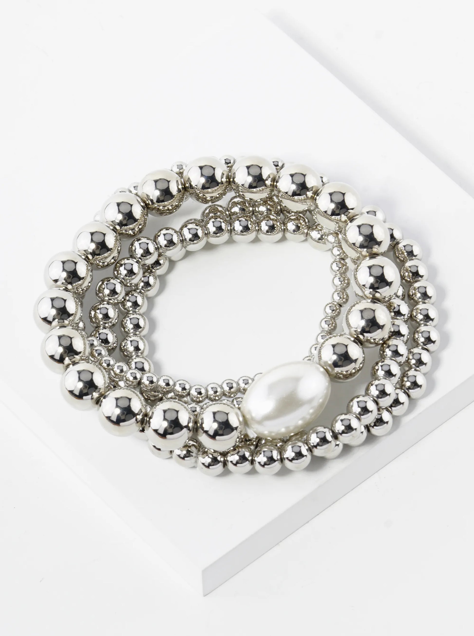 Set Of 5 Graduated Metallic Beaded Stackable Stretch Bracelet With Pearl Accents