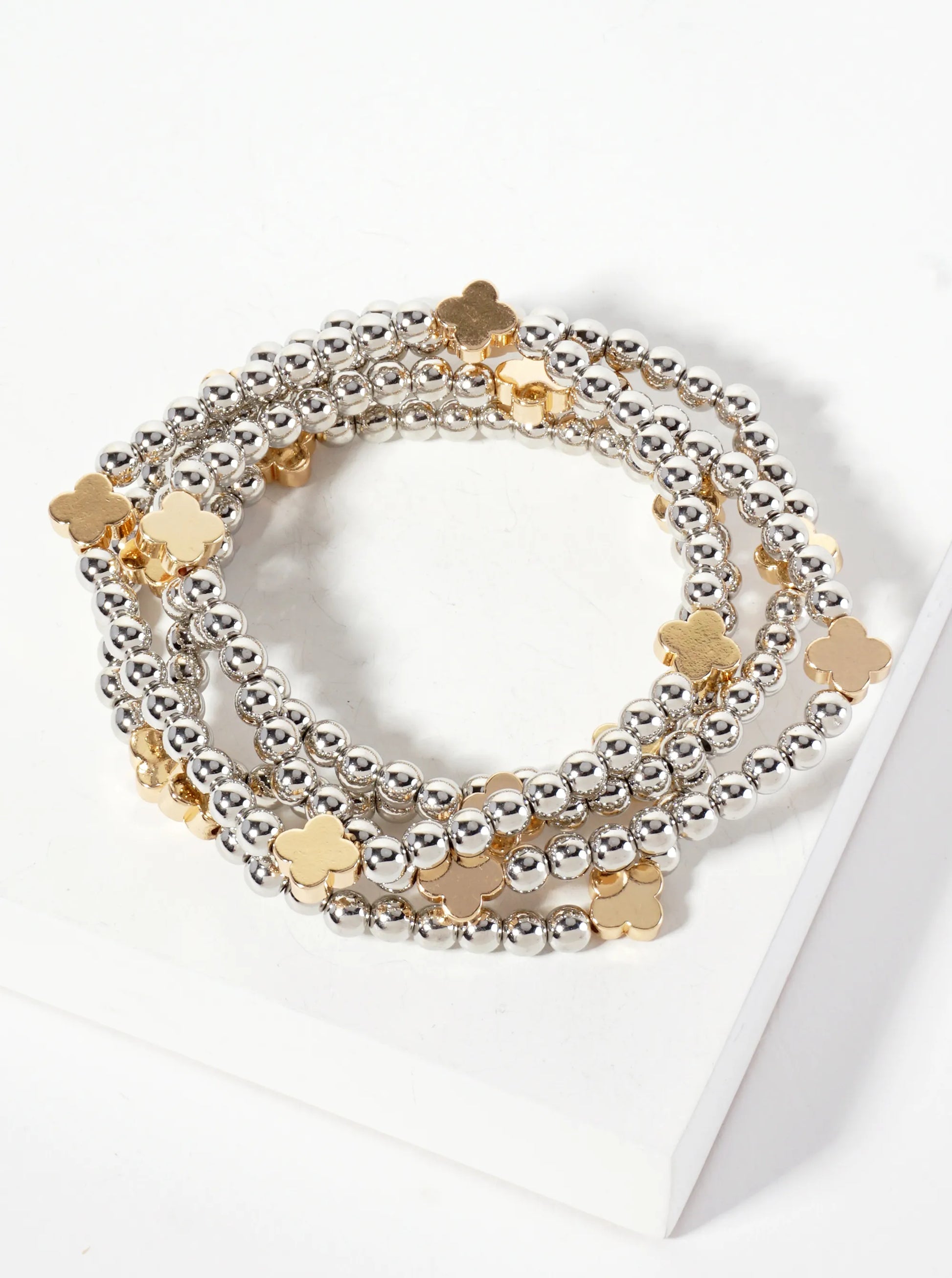 Set-of-5 Polished Metallic Quatrefoil And Ball-Beads Stackable Stretch Bracelet