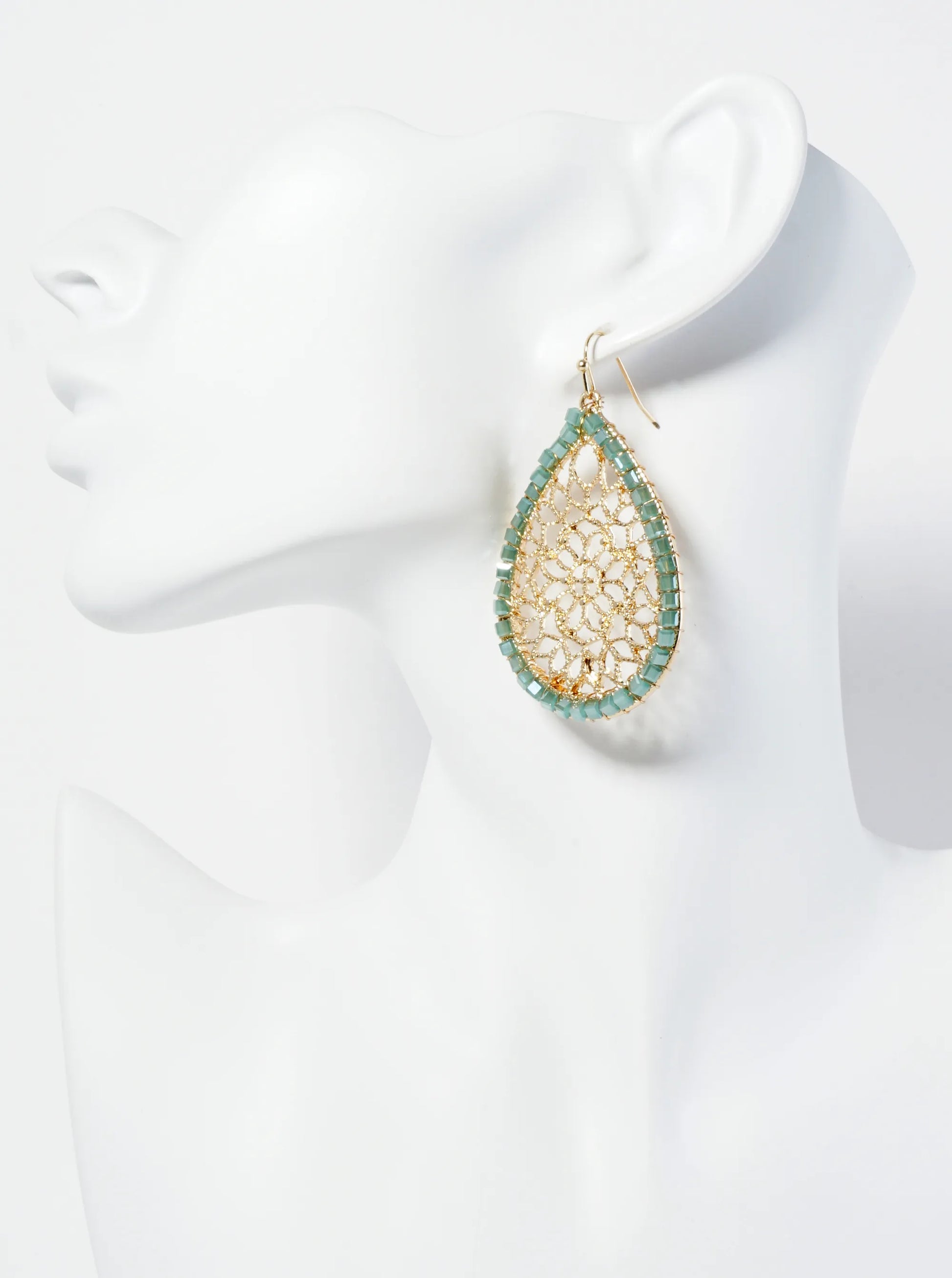 Square Glass Beads Wired Wrapped Filigree Teardrop Dangle Earrings